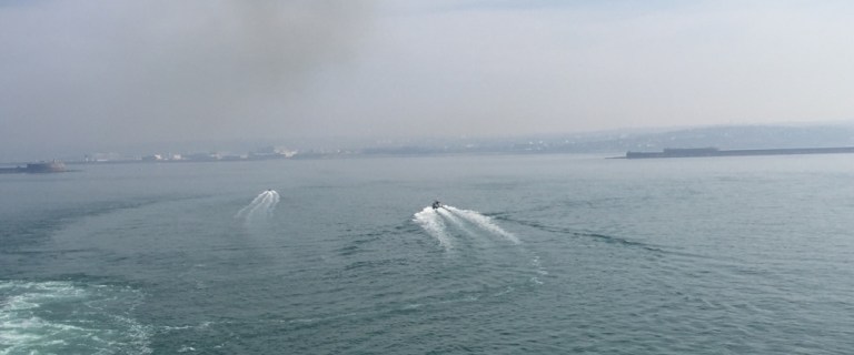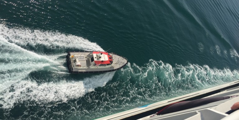 Schöne Ausfahrt, Seite an Seite mit einem Lotsenboot. Erst ausserhalb der äussersten Hafenmauer steigt der Lotse aus.