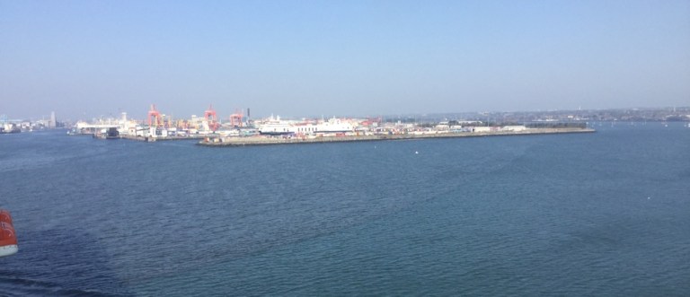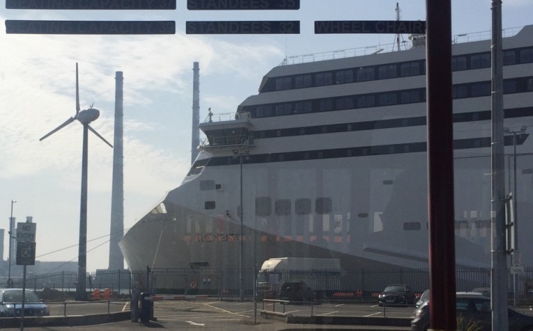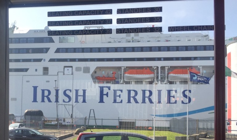 Weil bei der Bestellung dieses neuen Schiffs nur eine Seitentüre bestellt wurde, muss auch hier in Dublin mittels einer Busfahrt ab dem Lastwagendeck aus- bzw eingestiegen werden.