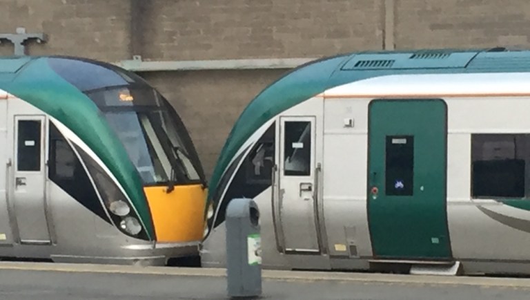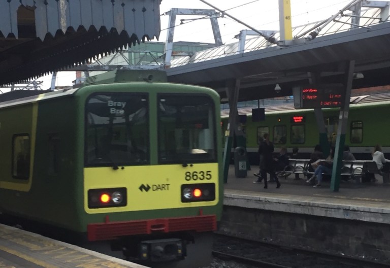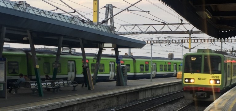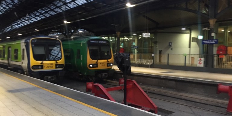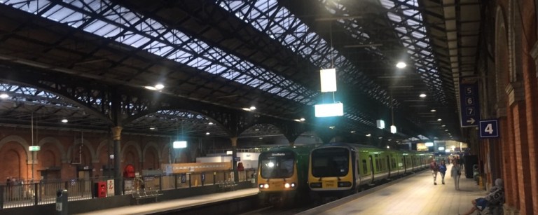 An der Connolly-Station beobachte ich das Treiben und die Züge (https://de.m.wikipedia.org/wiki/Schienenverkehr_in_Irland). Es herrscht recht starker Osternheimkehrer-Verkehr.