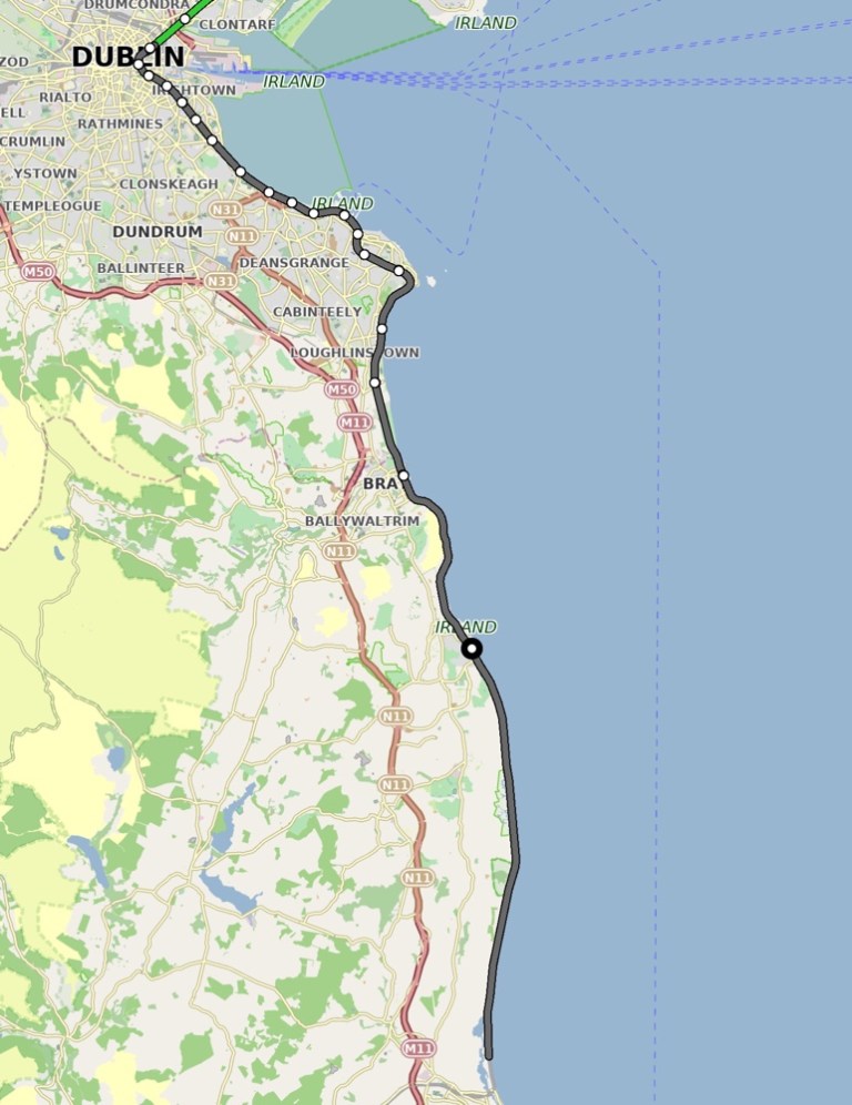Ich entscheide mich, heute eine Eisenbahnreise nach Rosslare Europort zu unternehmen. Zumindest die erste Hälfte der ungefähr 150 km langen Strecke soll sehr interessant sein, da sie zumeist am Meer entlang führt.