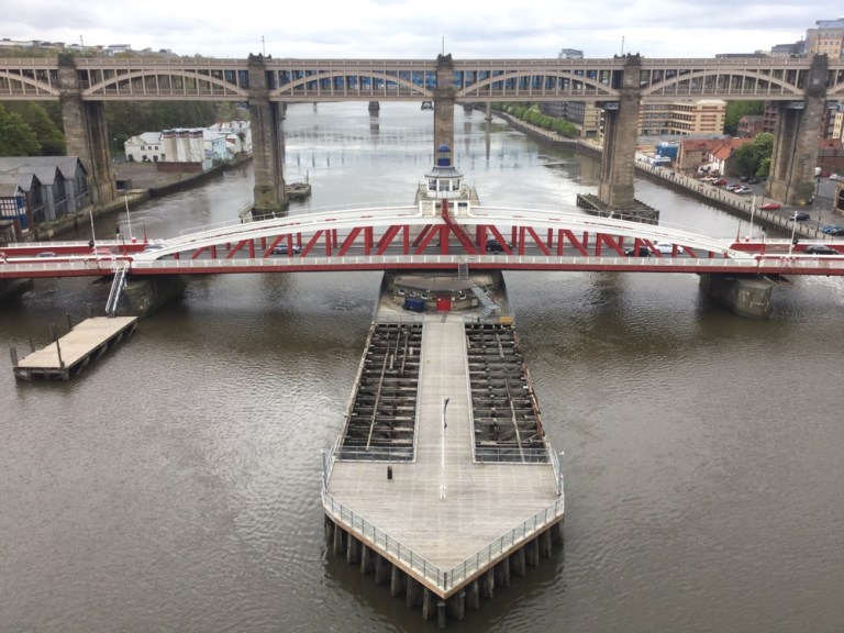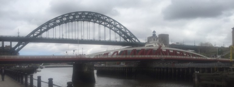 Auch die unterste der Stadtbrücken interessiert mich sehr. Die Gateshead-Milleniumbrücke (https://de.m.wikipedia.org/wiki/Millennium_Bridge_(Newcastle–Gateshead)) wurde erst 2001 in Betrieb genommen.