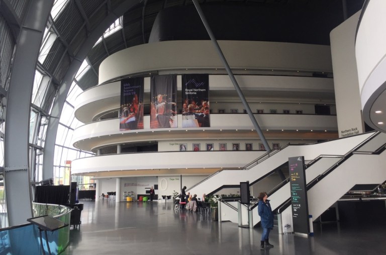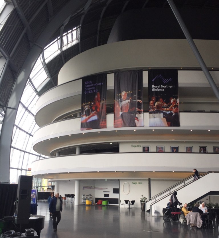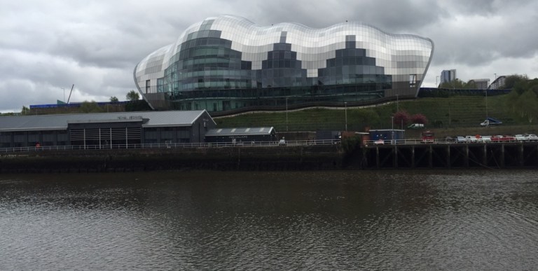 Jetzt geht es aber bergauf, über viele Treppenstufen bis zum Konzertgebäude Sage (https://sagegateshead.com). Auf der einen Seite rein,