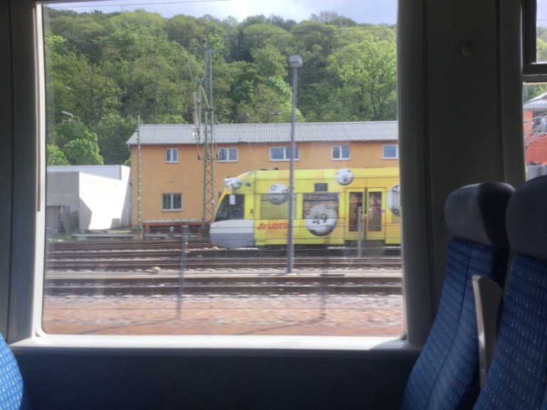 Fahre grad sofort weiter. Der Intercity 6 besteht aus Schweizerischen Wagen und ist unterwegs nach Hamburg. In der 1. Klasse sitzen erstaunlich wenige Leute, ich kann mich also herrlich ausbreiten, meine Handyakkus laden und ein Hotel in Düsseldorf buchen.