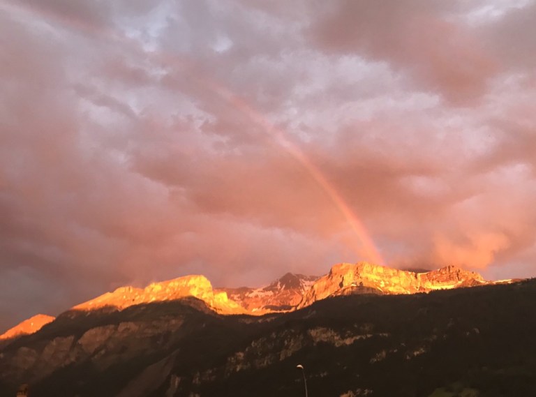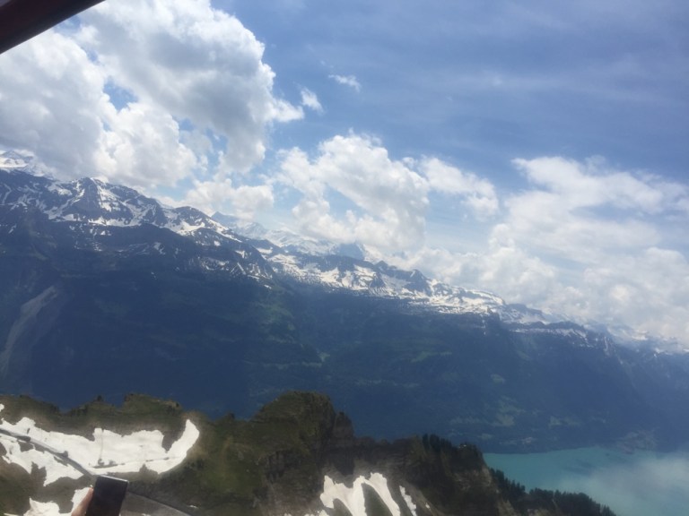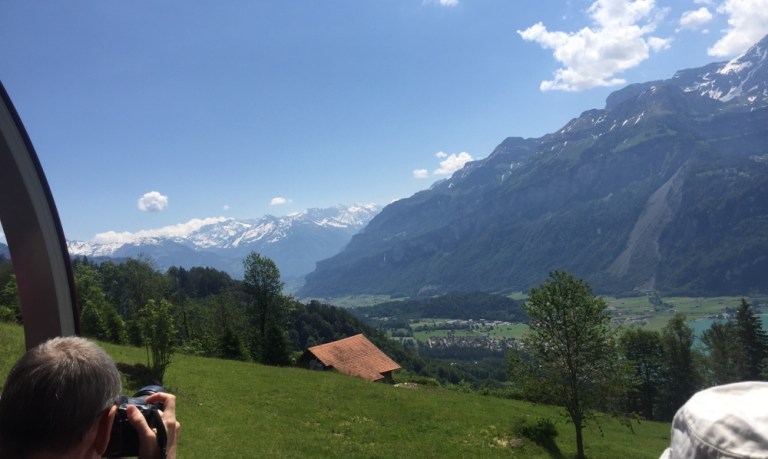 Kurz vor 13 Uhr oben. Schon während der Fahrt, wie auch hier oben, habe ich interessante Diskussionen mit Touristen sowie mit Dittmar einem ungefähr 20 Jahre jüngeren Deutschen, der in dieser Saison auf dem Niesen arbeitet.