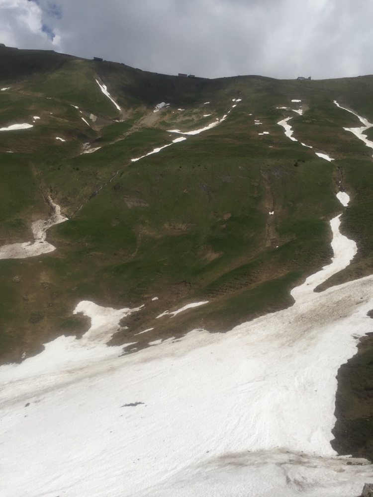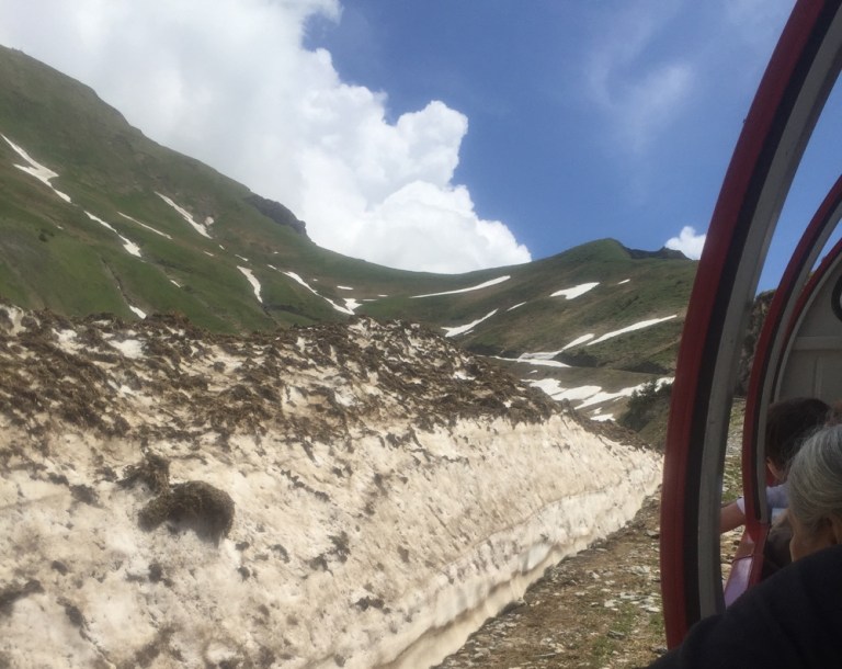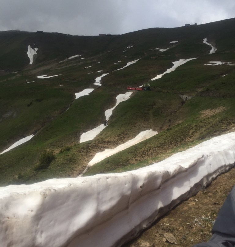 Ab Obrischte, dem oberen Stafel sind links und rechts der Bahntrasse, auch 14 Tage nach Eröffnung des Sommersbetriebs, noch über einen Meter hohe Schneemauern zu sehen.