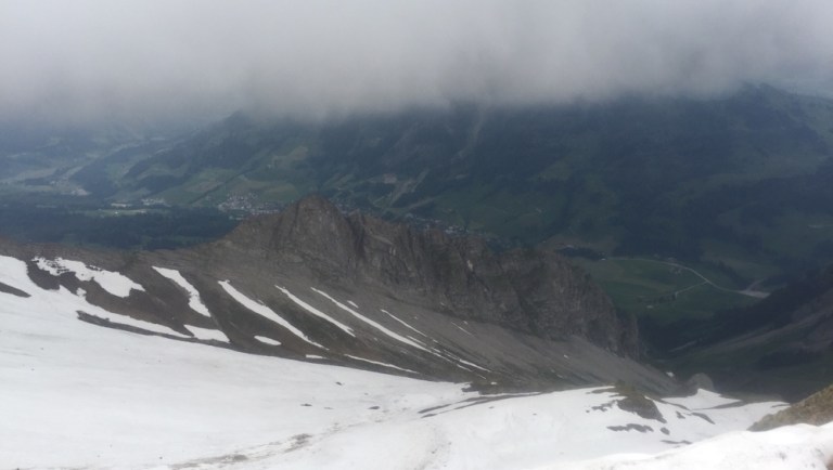 Ich beschliesse mit dem nächsten Zug um 14:28 Uhr runter zu fahren. Noch vor der Abfahrt sind die Gipfel rund herum in Wolken gehüllt.