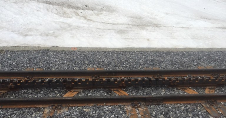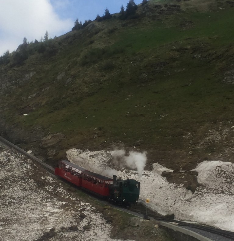 Nach dem Wasserfassen schnaubt unsere Dampflok mit uns weiter bergan. Ich frage mich, ob die Lok wohl eine Rauchgasreinigung oder einen Feinstaubfilter hat und ob es nicht ein, dem Diesel beizumischendes, Parfüm aus Alpenblumen gegen den Gestank dieser Heizölbrenner gäbe.