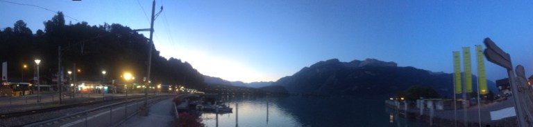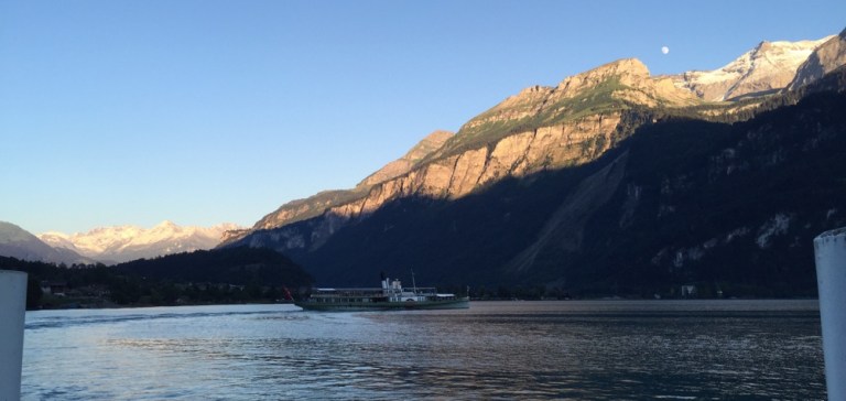und Visp. Umsteigen auf den Intercity durch den Lötschberg-Basistunnel und nach weiterem Umsteigen nach Interlaken und eNtlang dem schönsten See
