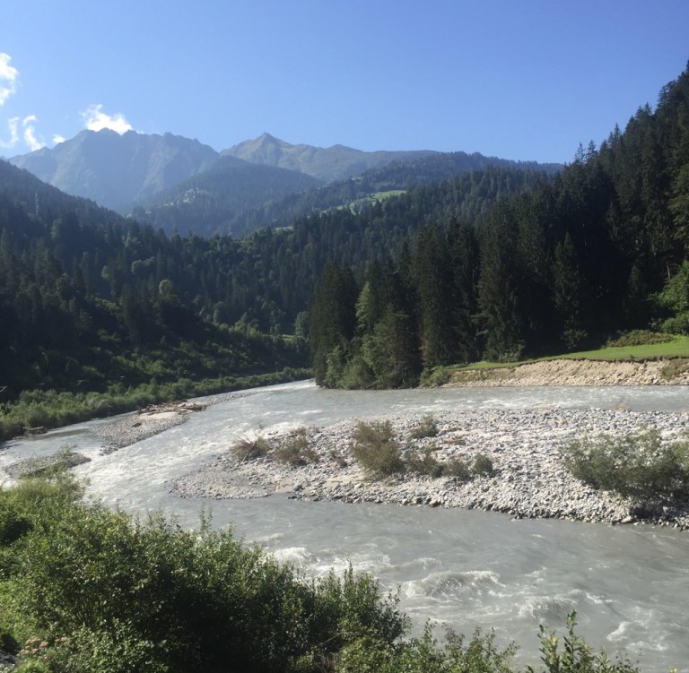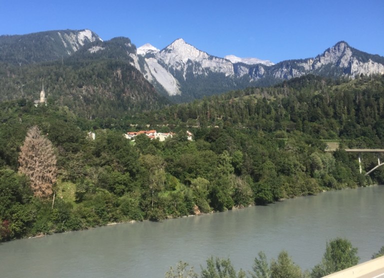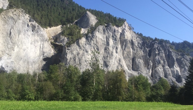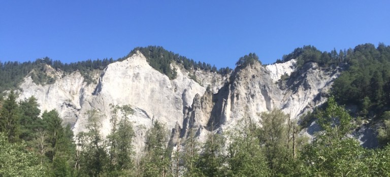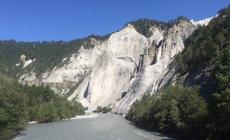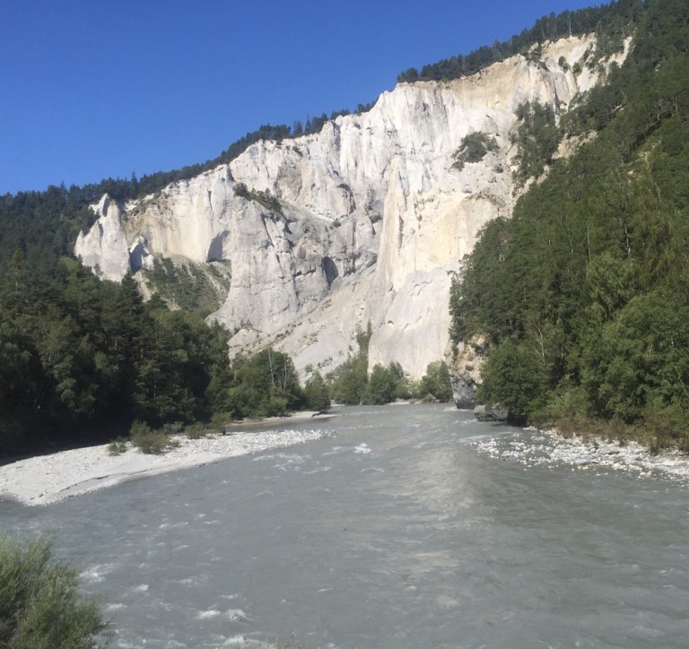 Ausgangs der Bahnstation queren wir auf einer neuen Brücke den Hinterhein, der hier auf den Vorderrhein trifft und ab hier somit zum Alpenrhein wird.