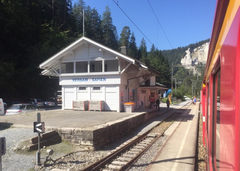 In den Bahnhöfen der Rheinschlucht steigen sicher Gruppenreisende aus. Es ist zum Schreien wie unorganisiert die Lehrer agieren: beim Anhalten sind die Schüler noch nicht bereit aufzustehen und auszusteigen. Dann wird nur bei einer Türe ausgestiegen und alle SchülerInnen (nicht nur die Bubis) meinen, sie müssten noch etwas turnen oder akrobatieren, bzw eine Show abziehen. So dauert jeder Halt über 5 Minuten!