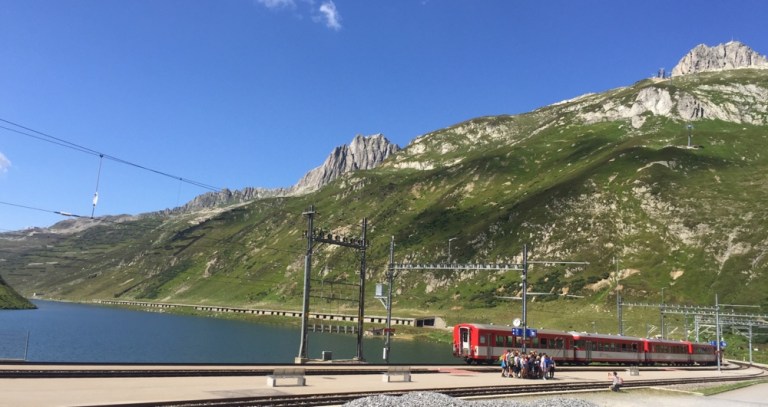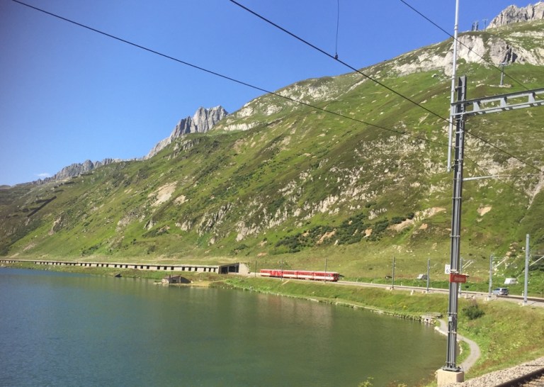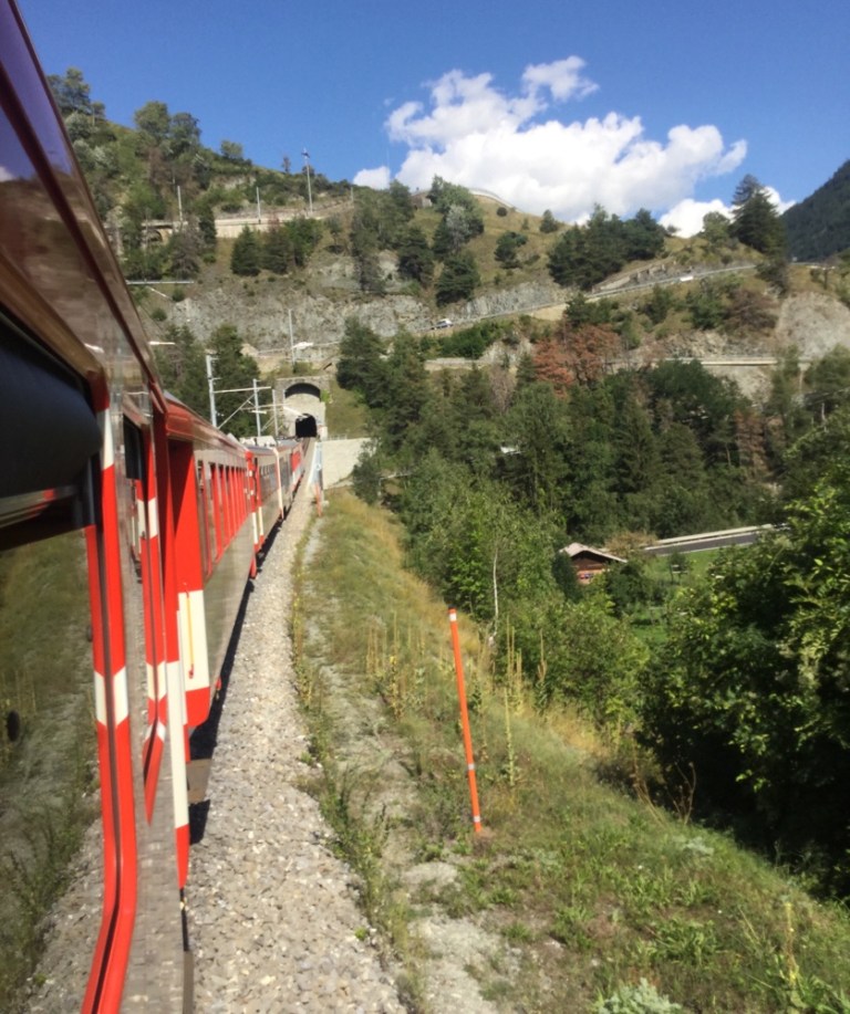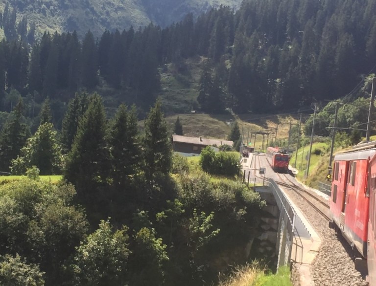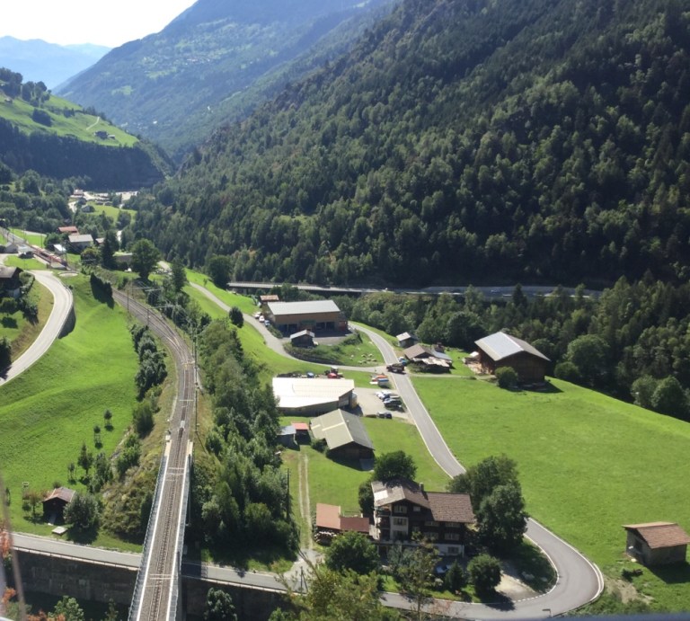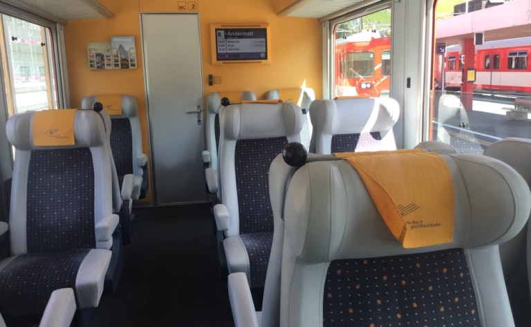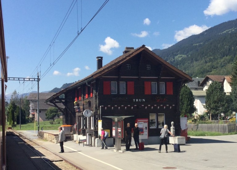 Die Schlange vor dem Schalter ist mir aber allzu lange, prognostizierte Wartezeit circa 15 Minuten. Online kann ich die obligatorische Reservation nicht kaufen, schade! Also kaufe ich mir nur ein Mineralwasser und steige in den RE der schmalspurigen rhätischen önach Disentis/Mustér ein. Die vielen Halte, sowie die Fenster die geöffnet werden können, lassen das Reisen ein Genuss werden.