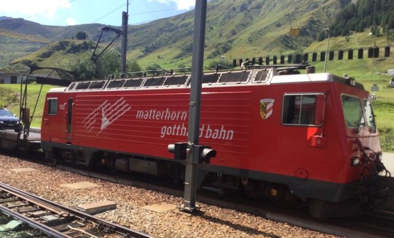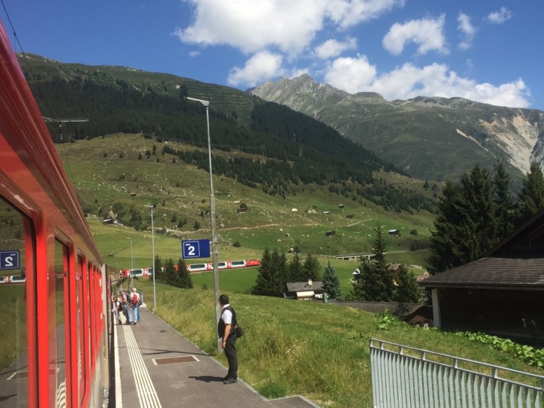 den rhätischen Endbahnhof Disentis/Mustér. Umsteigen auf den ungeduldig am gegenüberliegenden Gleis wartenden Zug der MGB > Mutter-Gottes-Bahn bzw Matterhorn-Gotthard-Bahn.