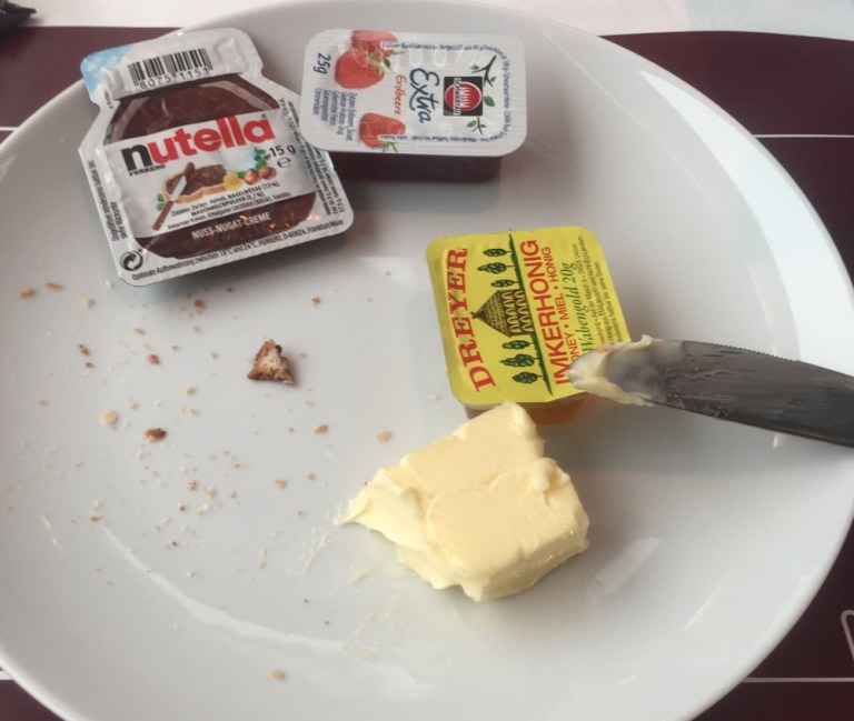 Endlich, eine halbe Stunde nachdem ich mich im Speisewagen hingesetzt habe, erhalte ich je eine Portion Butter, Marmelade, Honig und Nutella, sowie vier kleine, aufgebackene, steinharte Brötchen. Dazu trinke ich eine grosse Tasse Kaffee — muss aber weitere 15 Minuten auf den Kaffeerahm warten.
