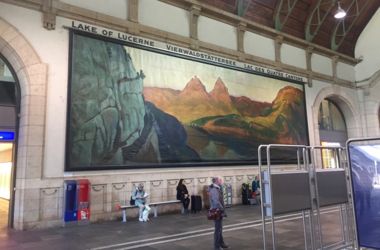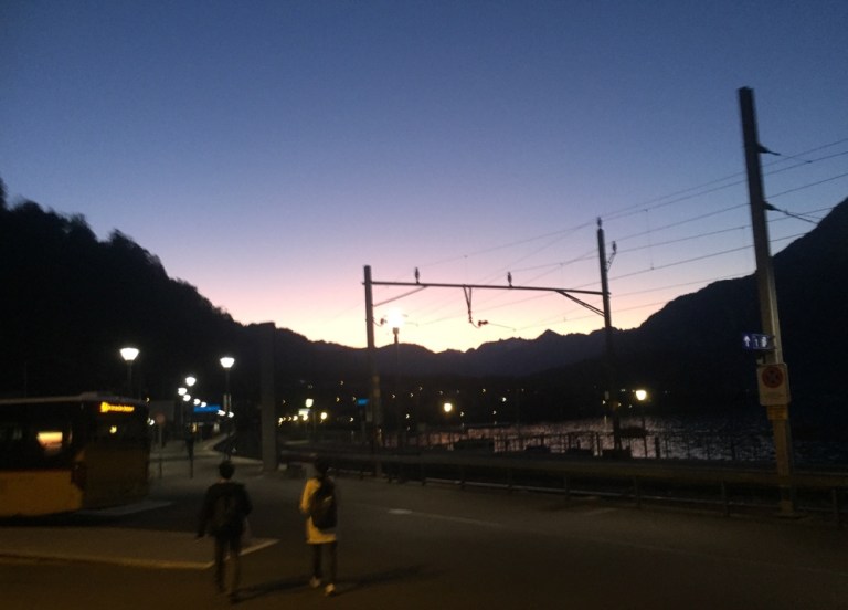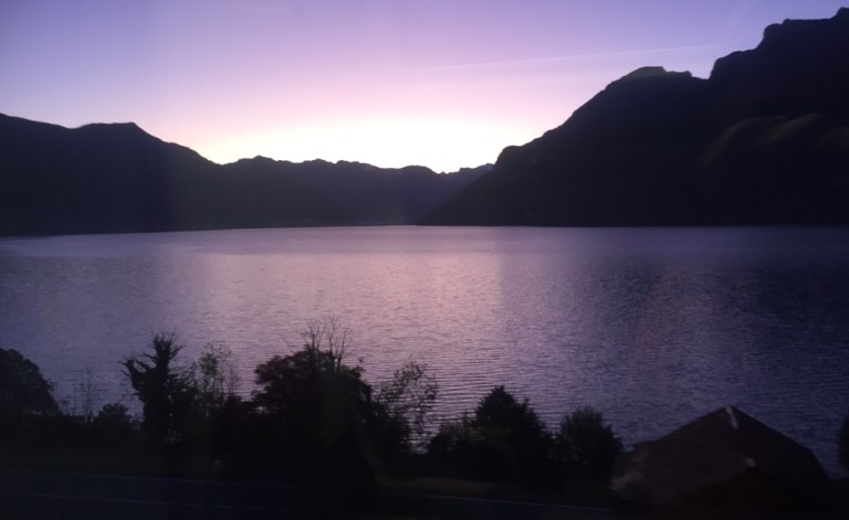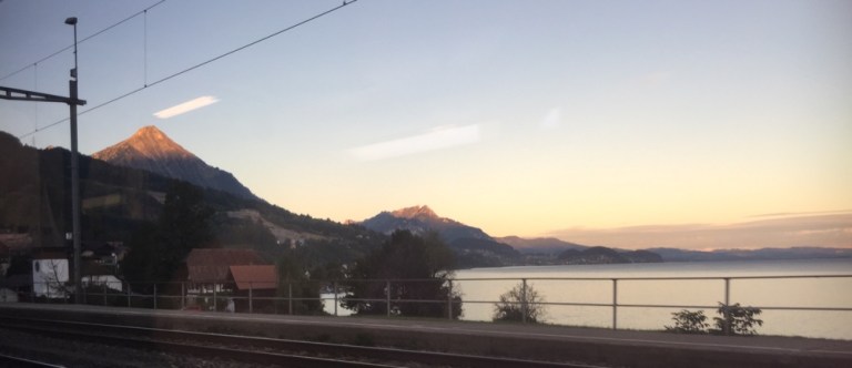 Obligates Umsteigen in Interlaken. Während der Fahrt am Thunersee entlang berühren die ersten Sonnenstrahlen die Berggipfel. Vor 10 in Basel, habe Zeit meine Füsse zu vertreten.