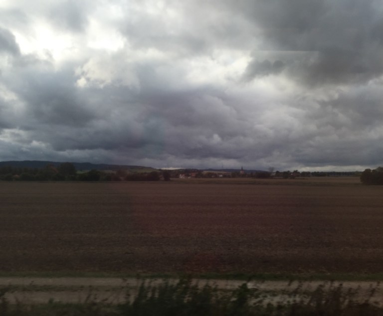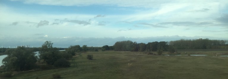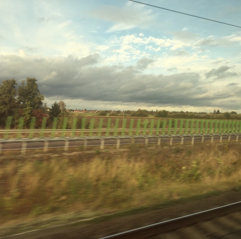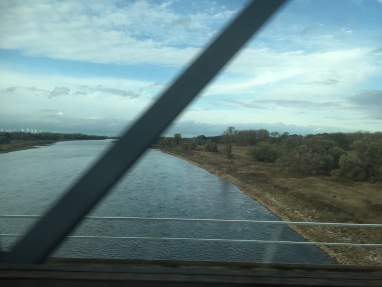 Bald darauf überqueren wir die frühere innerdeutsche Grenze. Nun fahren wir schnell, die Strecke ist neu und Fadengerade! Die Landschaft verändert sich noch immer: grössere, zusammenhängende Ackerflächen, riesige Wälder, Brachland. 17.10 überqueren wir die Elbe.