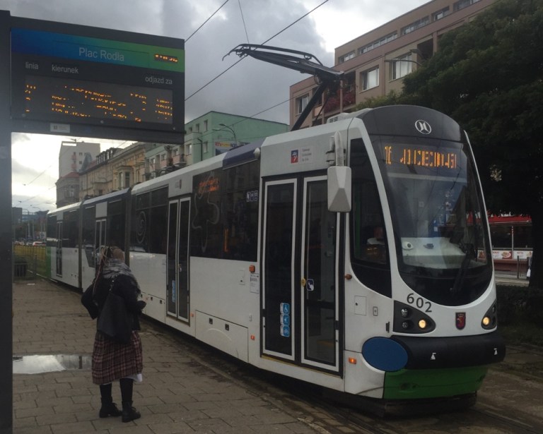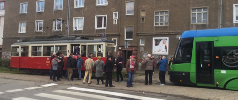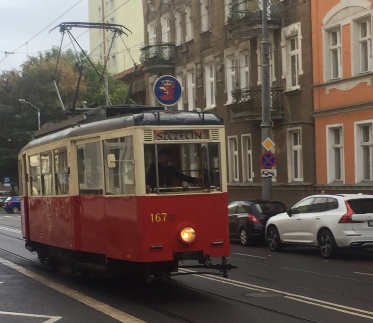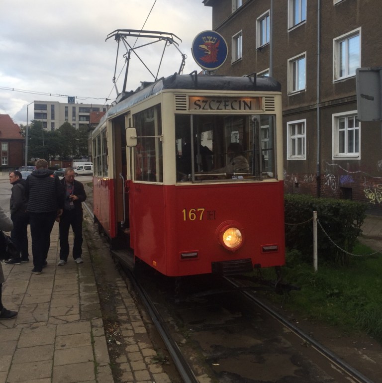 Um 15 Uhr starten wir zu einer knapp 3-stündigen Rundfahrt durch Stettin in einem historischen 2-achsigen Tramwagen mit gerade mal 12 Sitzplätzen.