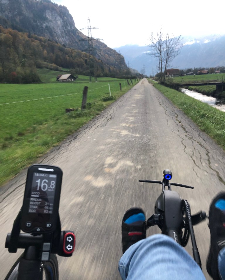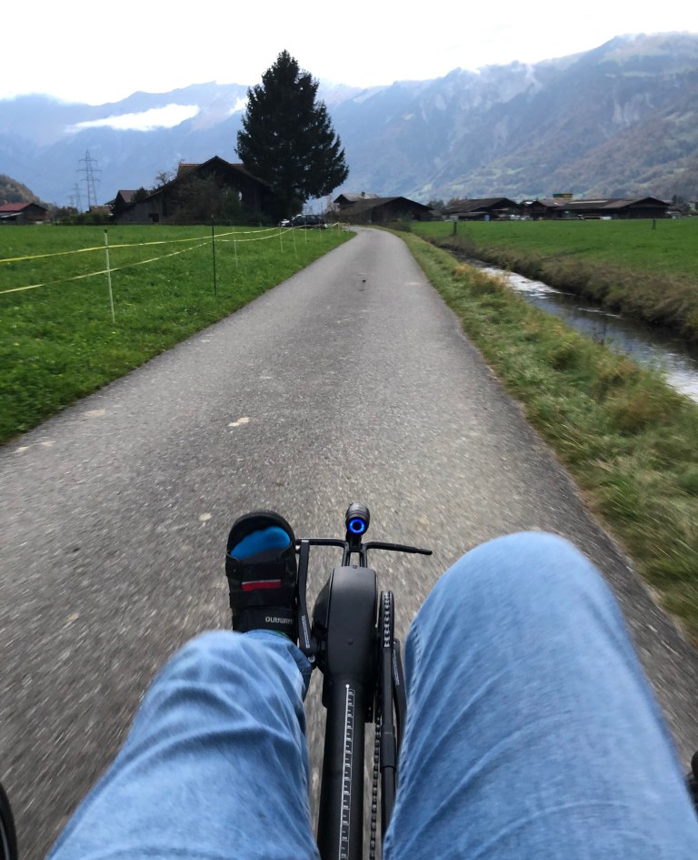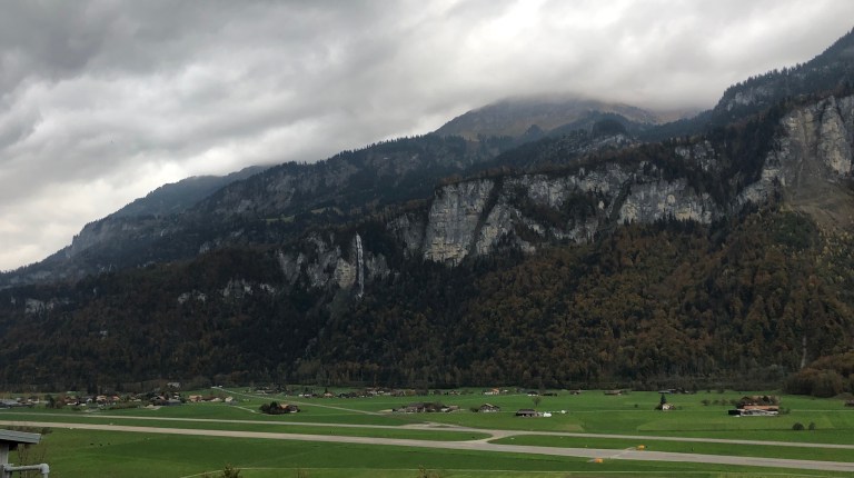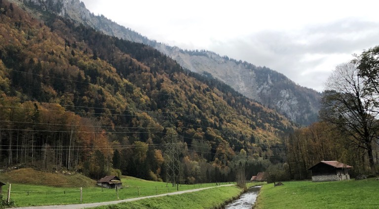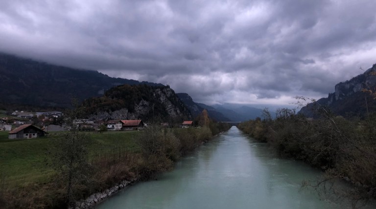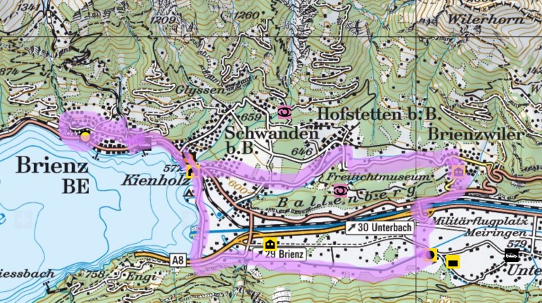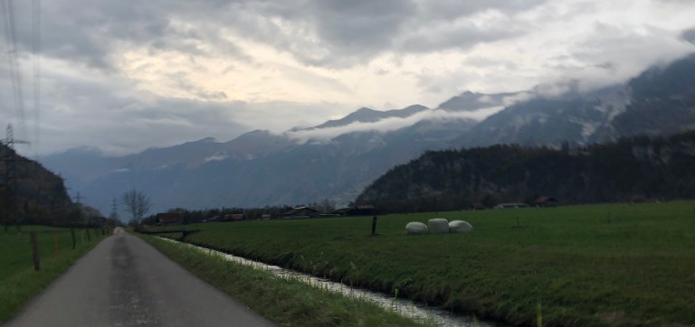 Weiter geht es in rascher Fahrt. Den Bahnhof Brienzwiler rechts liegen lassend überquere ich die Aare und kurz darauf das westliche Ende der Startbahn des Militärflugplatzes Unterbach-Meiringen. In der Goldey biege ich scharf rechts ab, radle nun entlang des Oltschibachkanals bis zum Brienzersee.