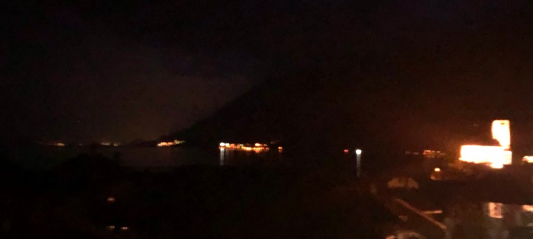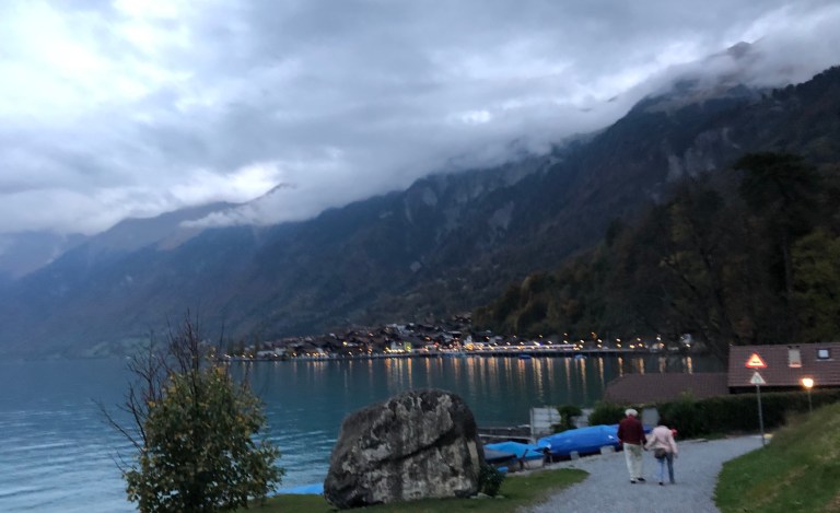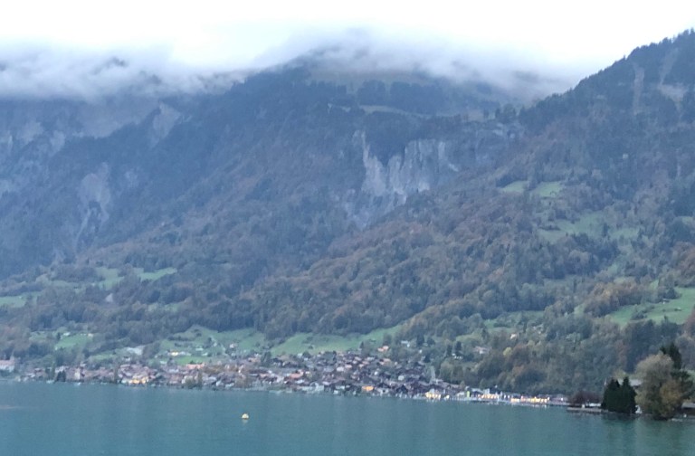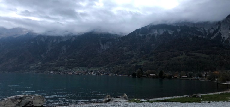 Am Strand des Aareggs, am oberen Ende des Brienzersees muss ich anhalten und die Aussicht geniessen. Die Dämmerung hat eingesetzt, die ersten Lichter im Dorf brennen. Der Brienzergrat ist Nebelverhangen.