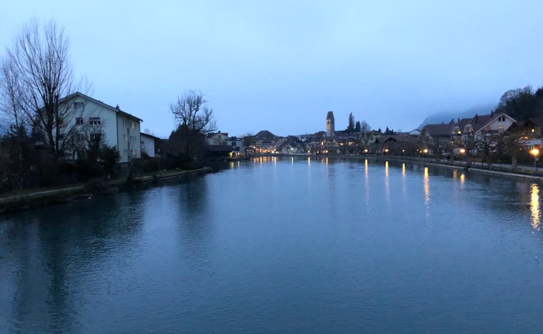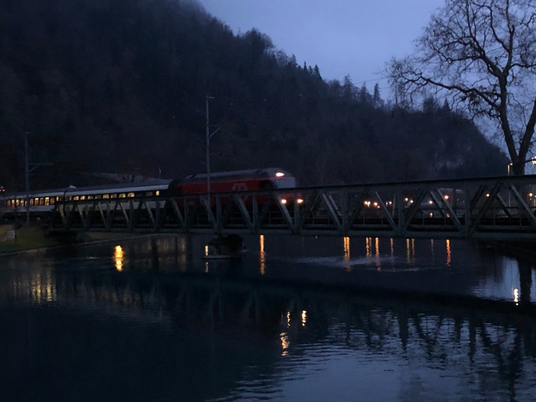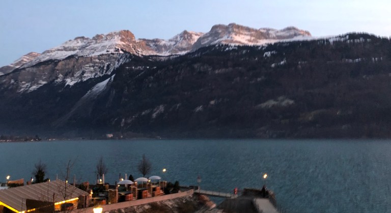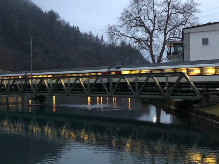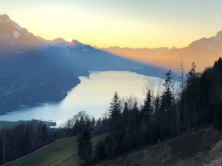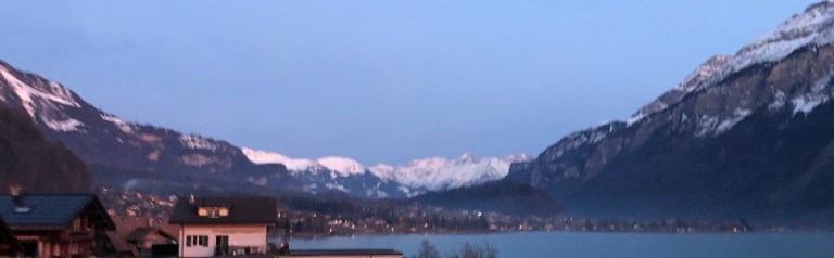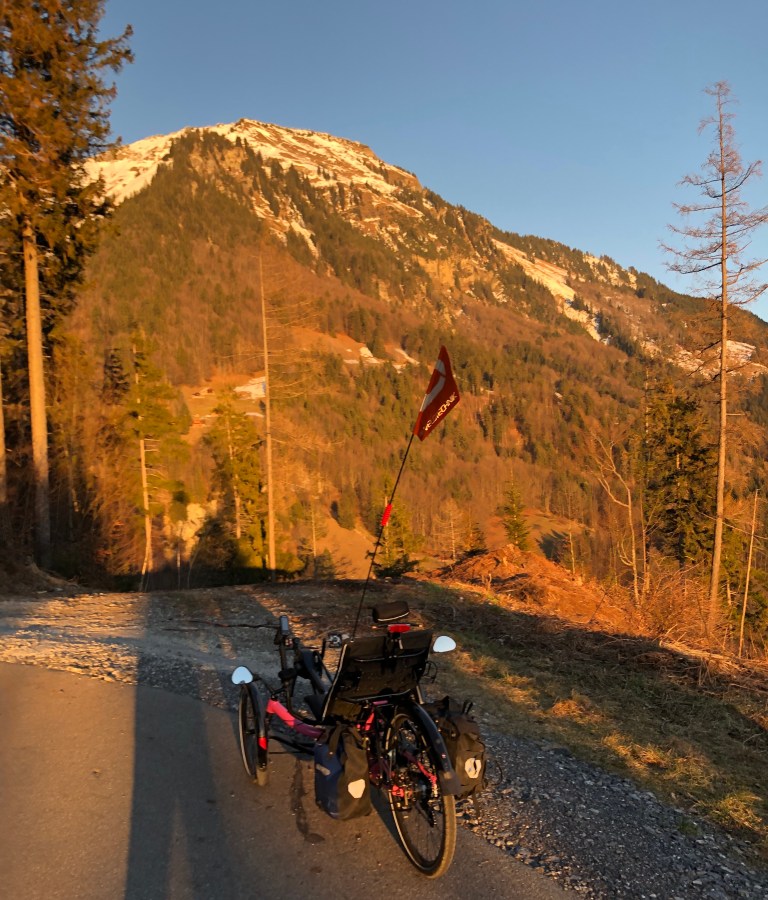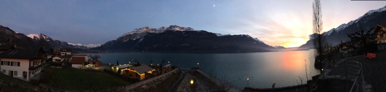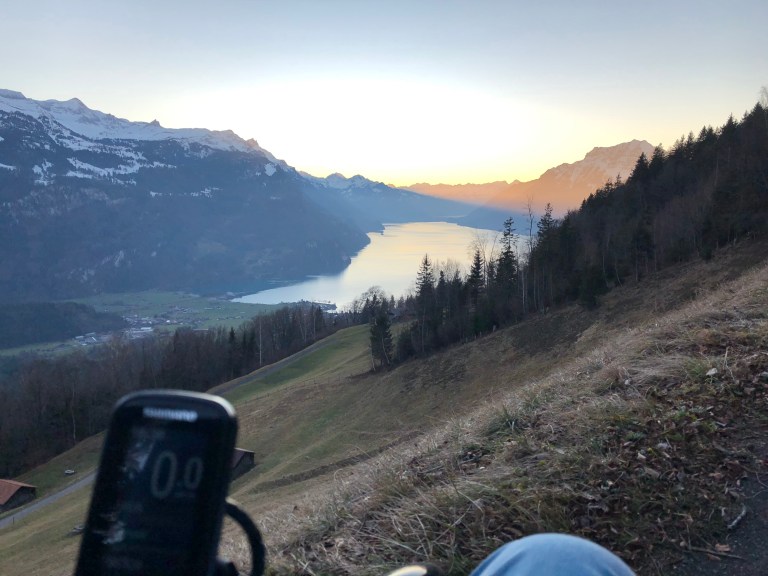 Gegen 15 Uhr bin ich dann aber doch bereit mich auf mein bequemes Dreirad zu setzen und los zu pedalen. Die ersten 500 Meter rolle ich entlang dem Brienzersee, die Sonne ist eben daran hinter den südlichen Bergen zu verschwinden bzw unter zu gehen.