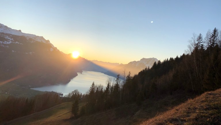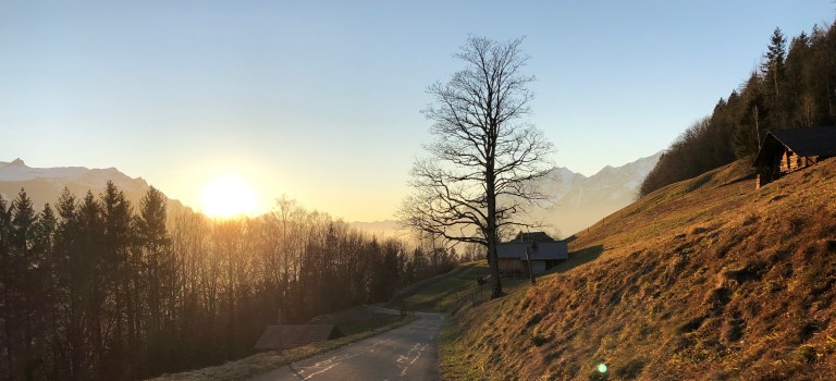 Auf etwas über 1000 m über Meer, auf dem oberen Hofstetter Bärgli muss ich um 16.36 Uhr kapitulieren. Die Sonne geht runter beziehungsweise verschwindet hinter den Bergen.