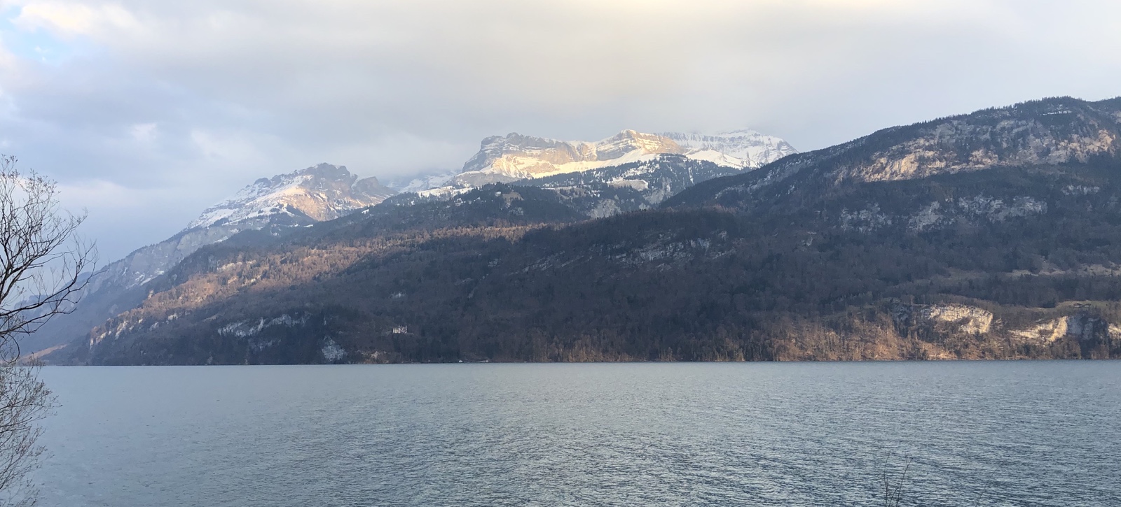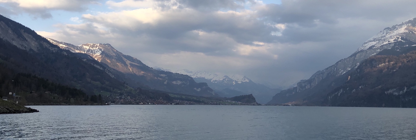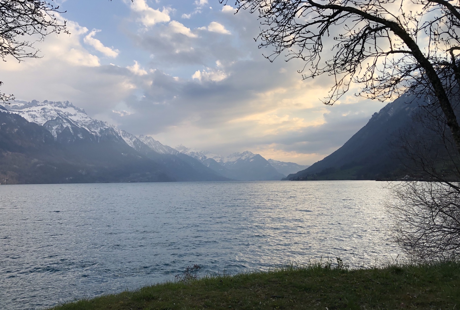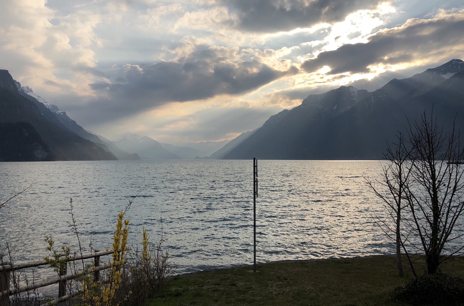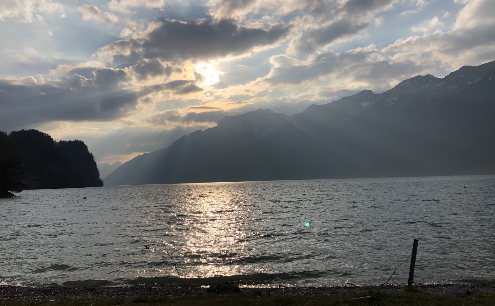 Ich geniesse den Ausblick auf den aufgerauhten See und die von grösseren dunklen Wolken halb verdeckte Sonne.