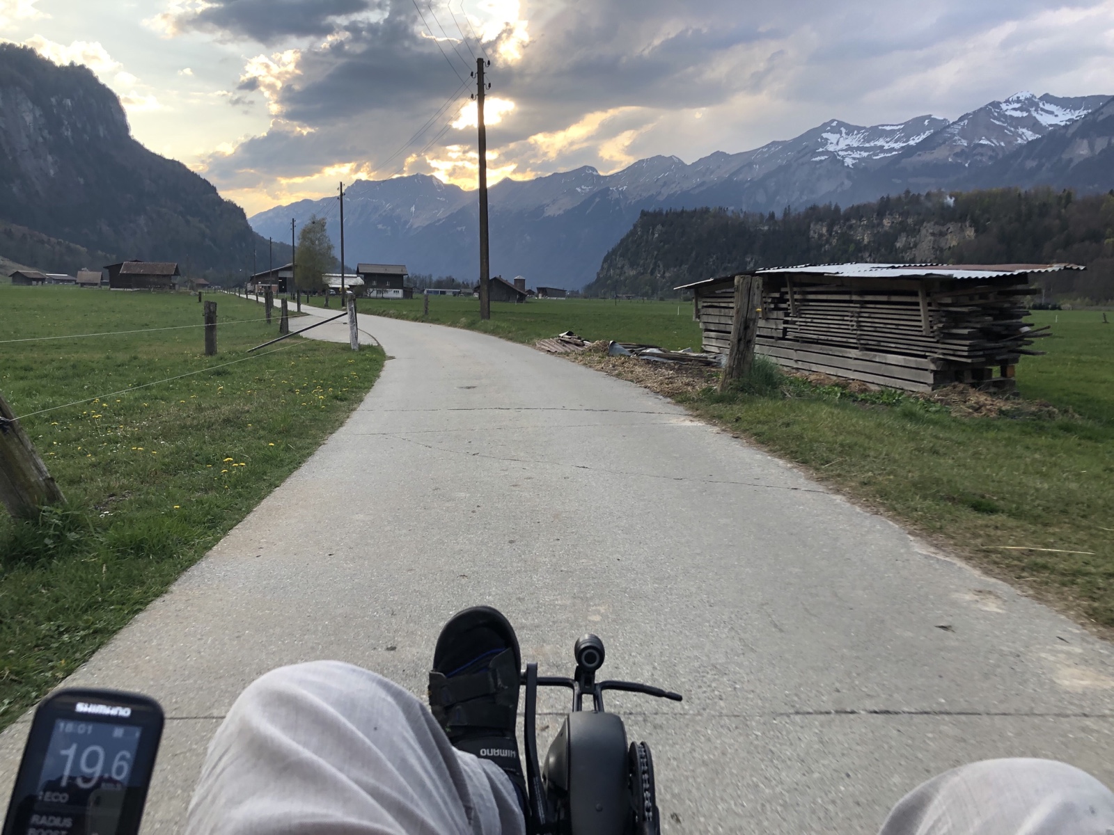 Erst gegen 17 Uhr werde ich richtig wach. Der Biswind scheint einzuschlafen, also ziehe ich mich an und fahre bald mal los, mit dem Rad in Richtung Meiringen.