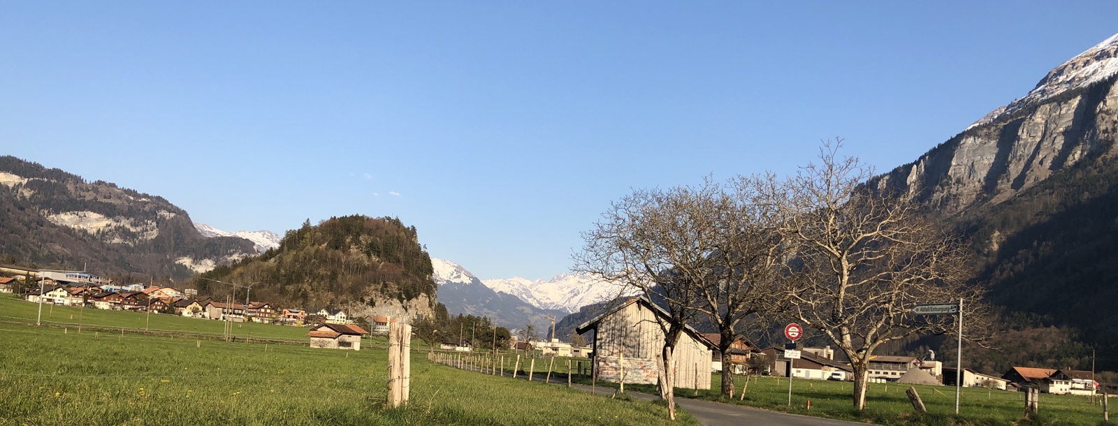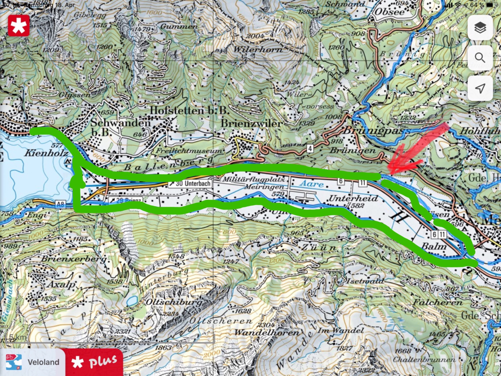 führt der Veloweg nach dem Bahnhof Brienzwiler auf der nördlichen Talseite, in Fahrtrichtung gesehen links von Aare und Eisenbahn nach Osten.