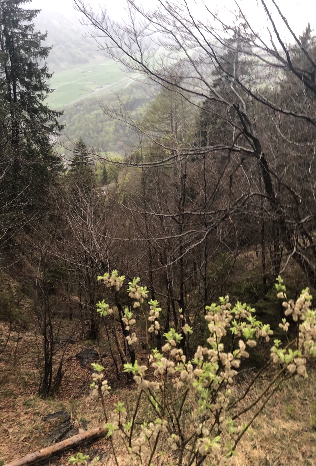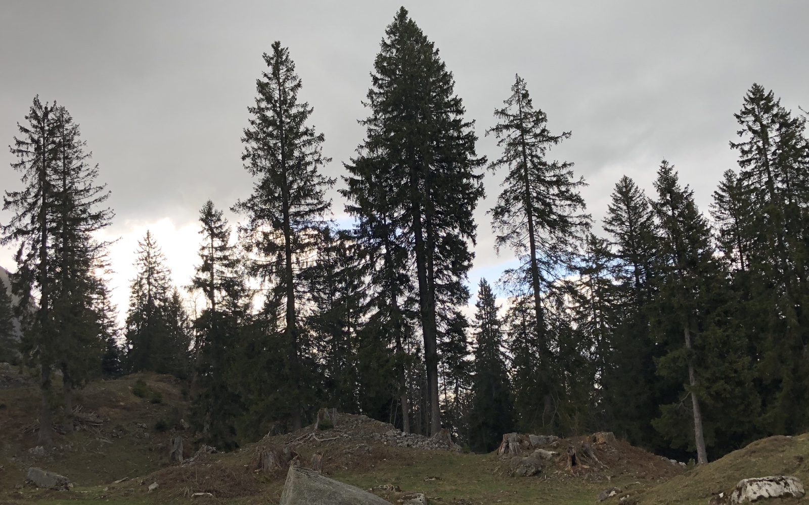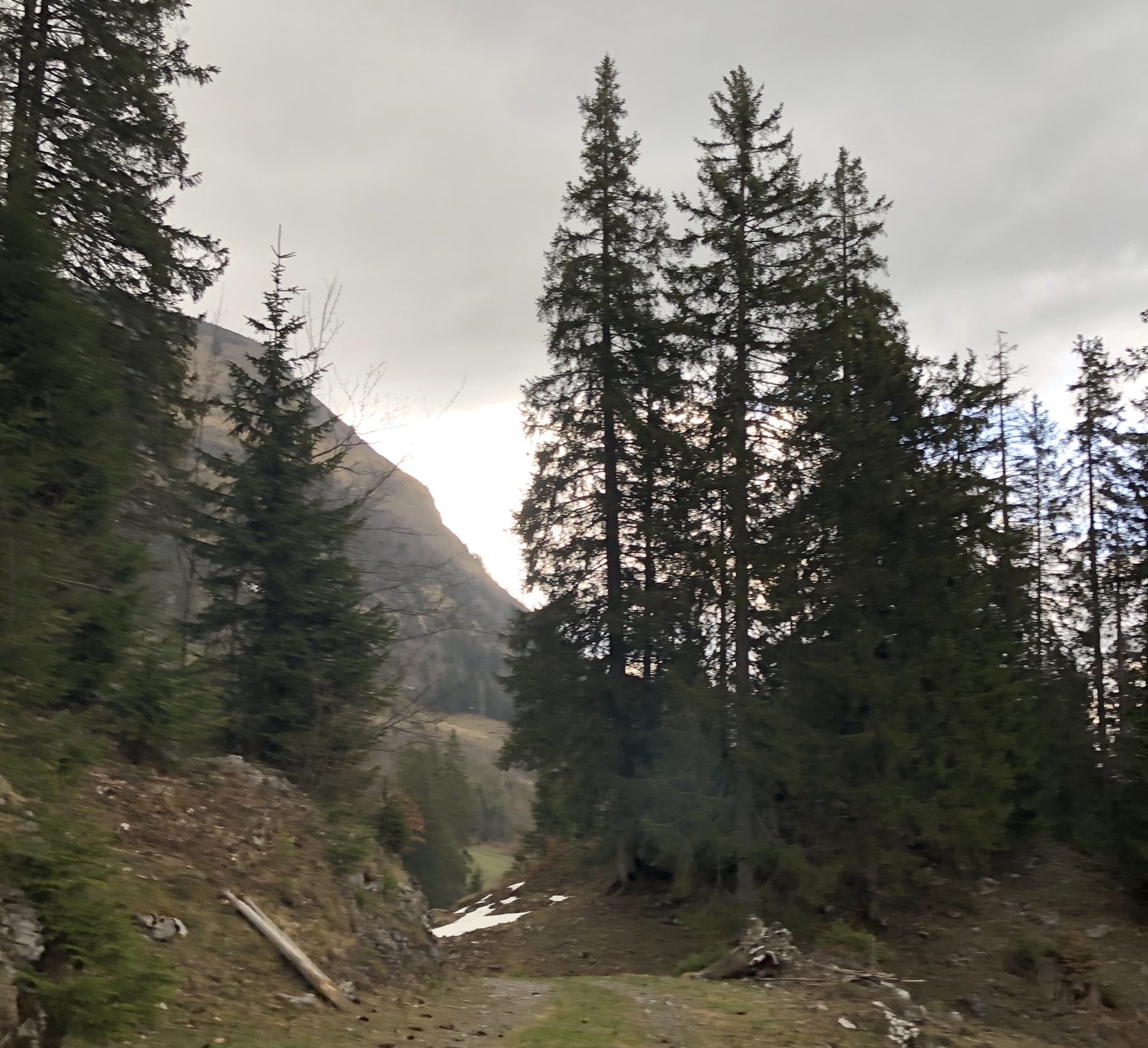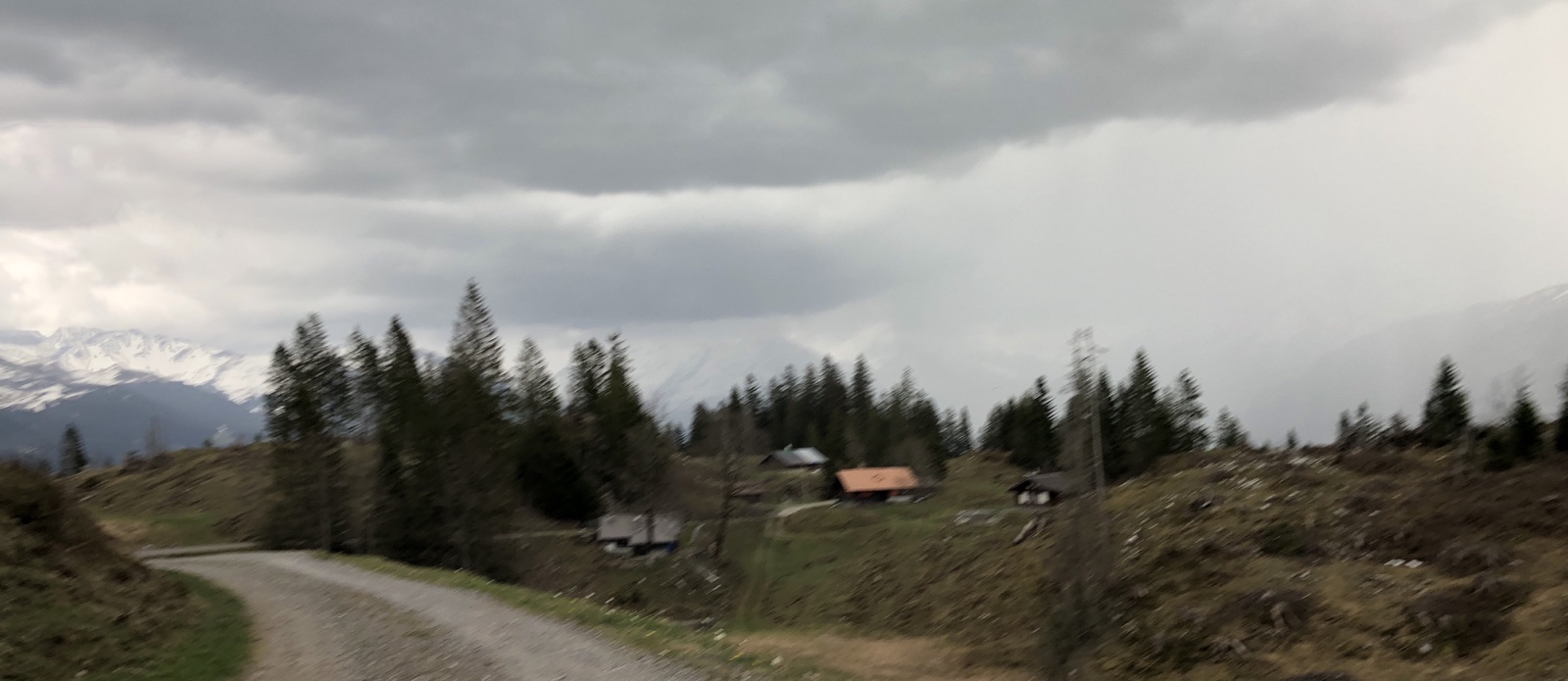 Auf 1300 m über Meer, bei der Biegung der Strasse Richtung Norden und zum Antennenwald am Totzweg, ist die Strasse mehrheitlich nass und es riecht nach Staub.