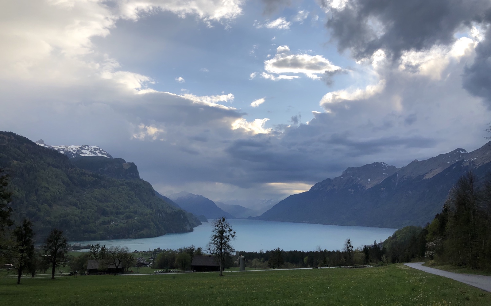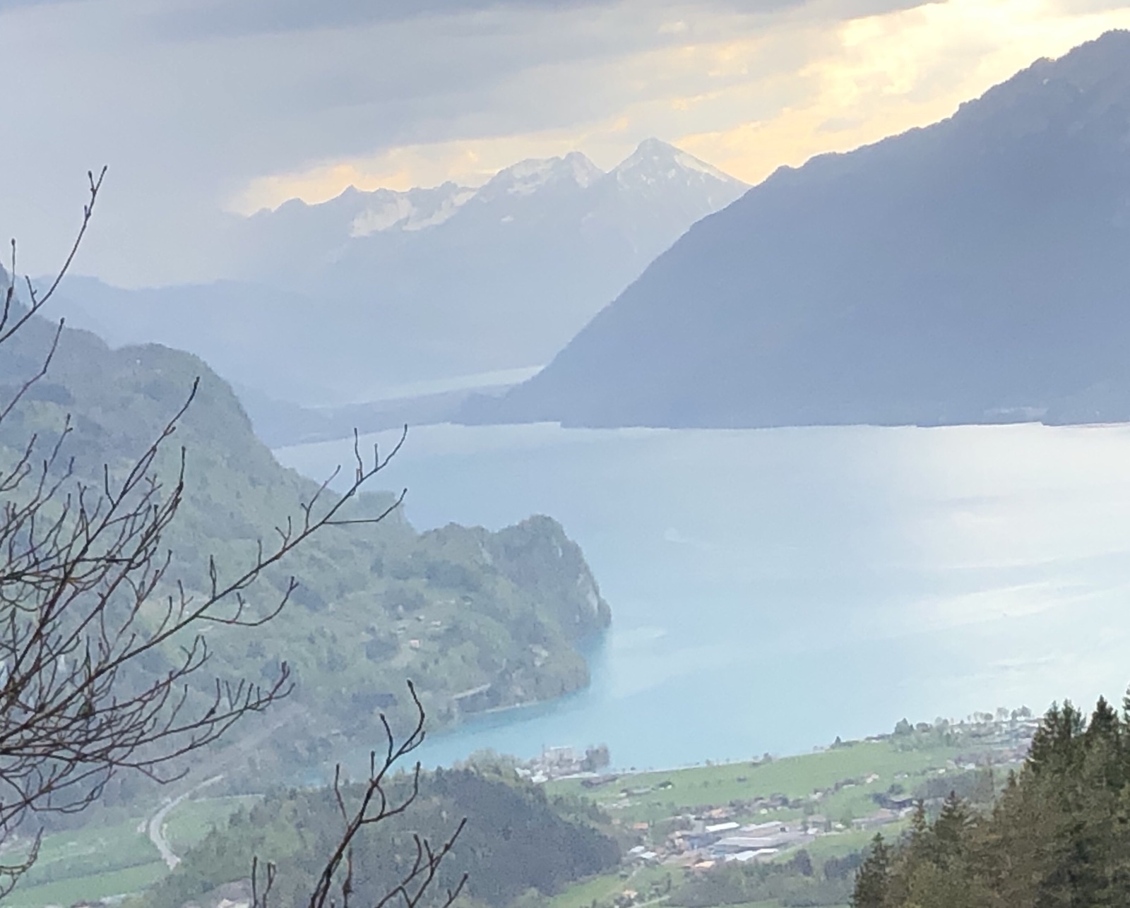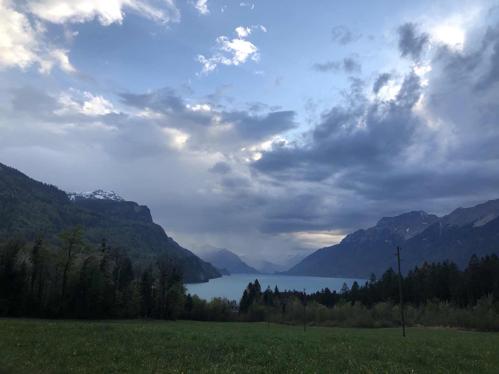 Auch der See leuchtet herrlich Türkisfarben. Vom Niesen wie auch vom Bödeli her, scheinen weitere Regenwolken hierher zu kommen.