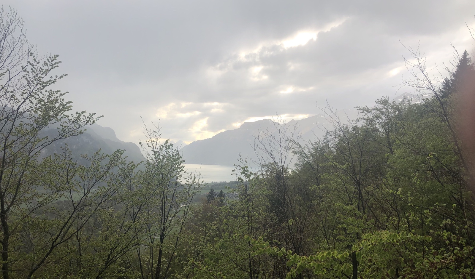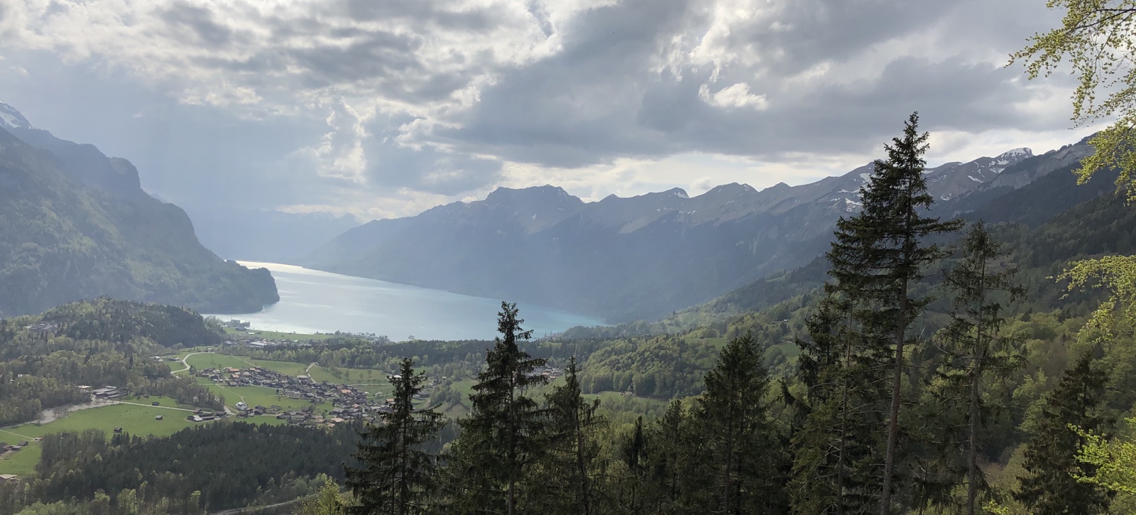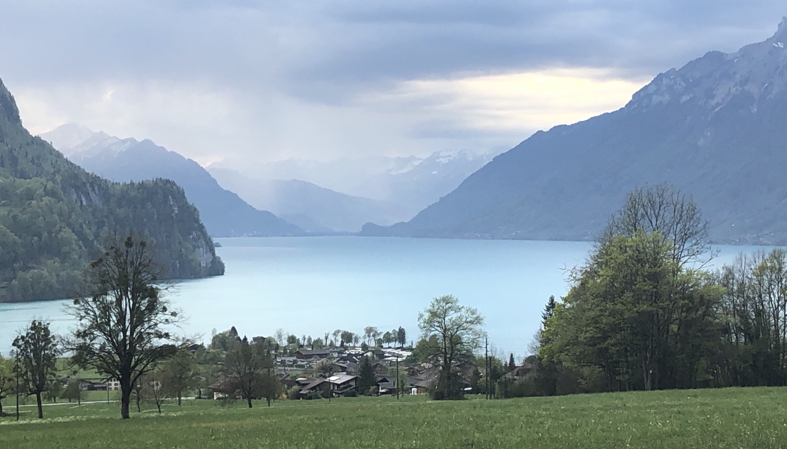 Auch der See leuchtet herrlich Türkisfarben. Vom Niesen wie auch vom Bödeli her, scheinen weitere Regenwolken hierher zu kommen.