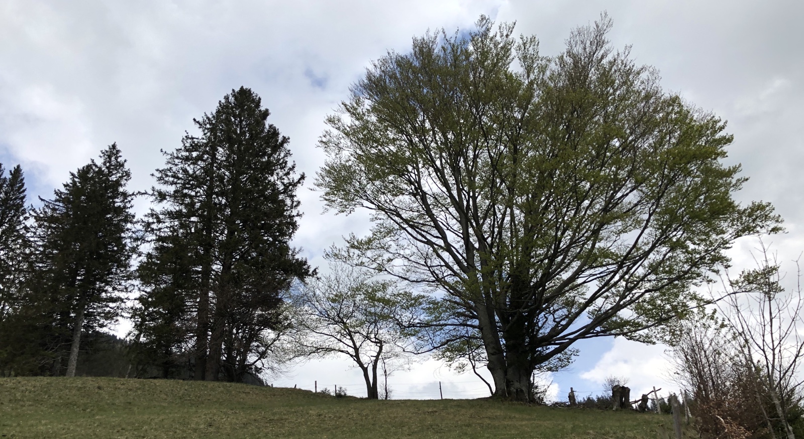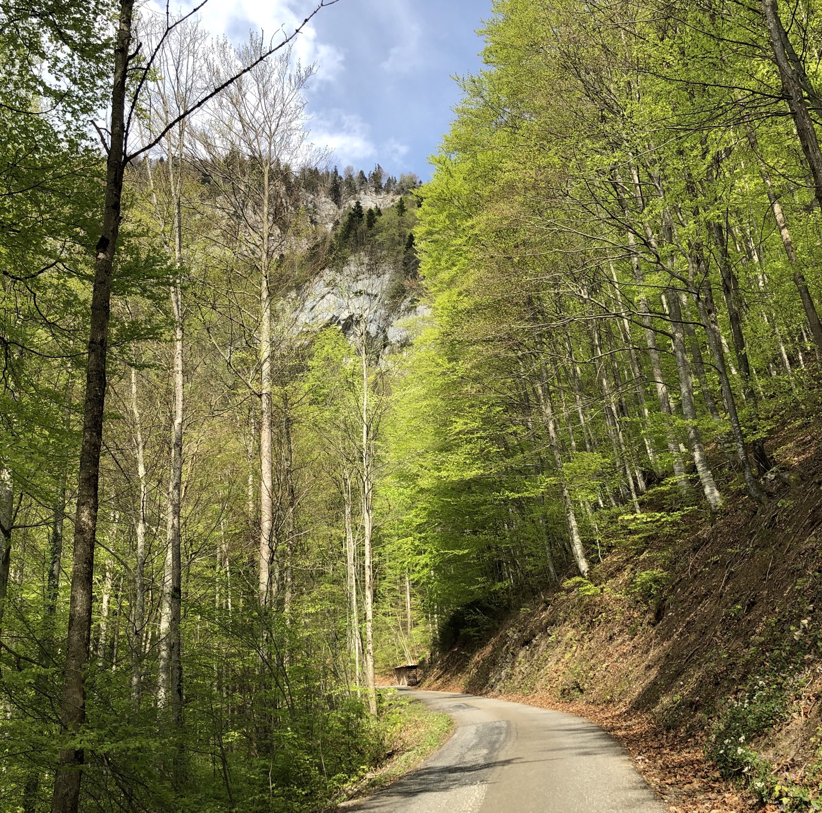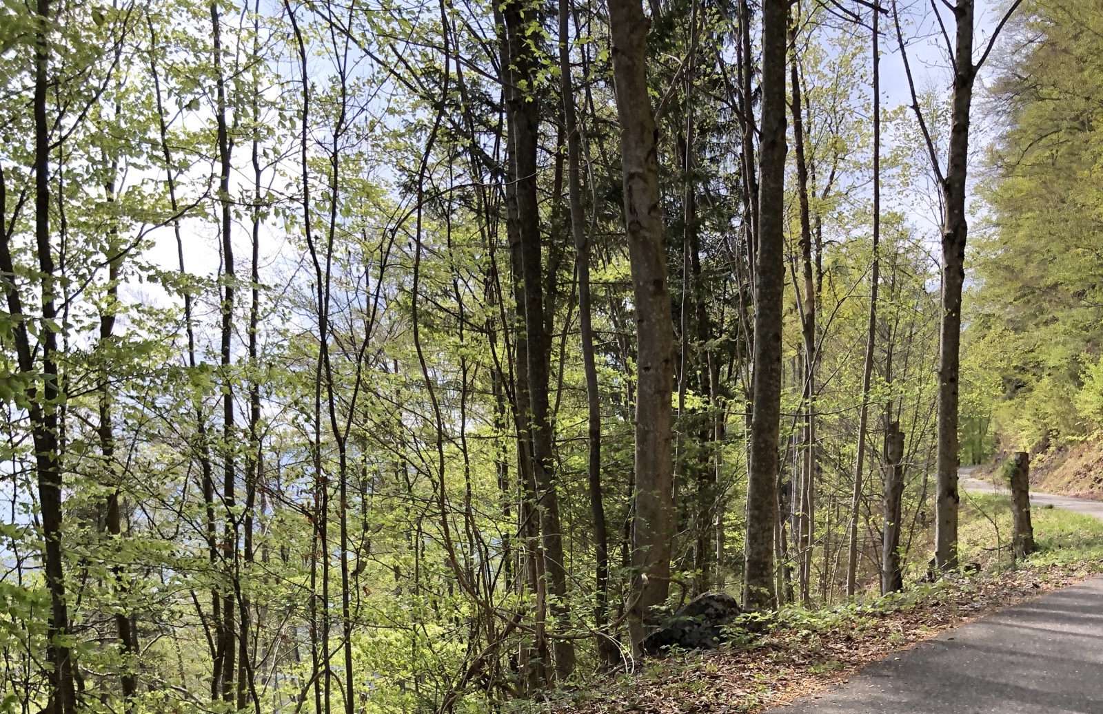 Bei Punkt 766 im Soliwald biege ich nach links ab auf die asphaltierte Alpstrasse zur Wilervorsess. Im lichten Buchenwald führt die Strasse stetig steigend zuerst nach Westen.