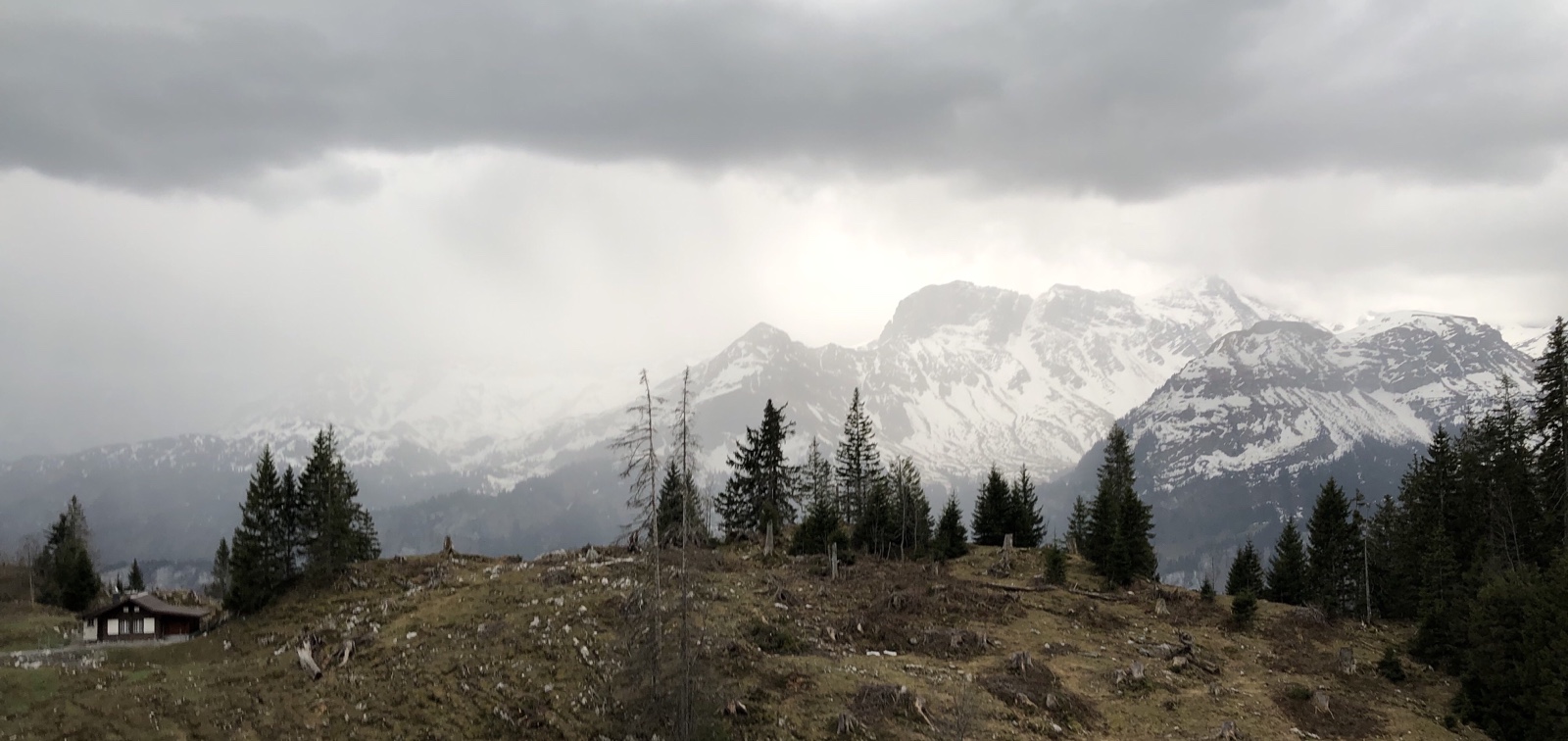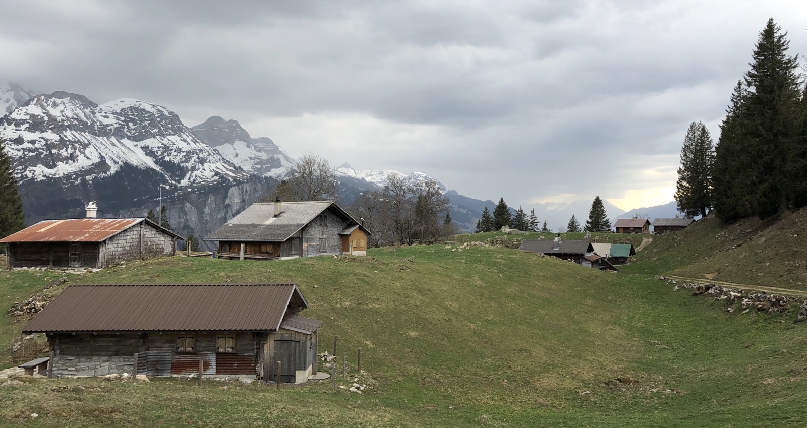 Ich rolle nun langsam talwärts. Da es auch am Vogelbiel noch mehrheitlich trocken ist, verlasse ich den Ort mit den letzten Schutz bietenden Alphütten.