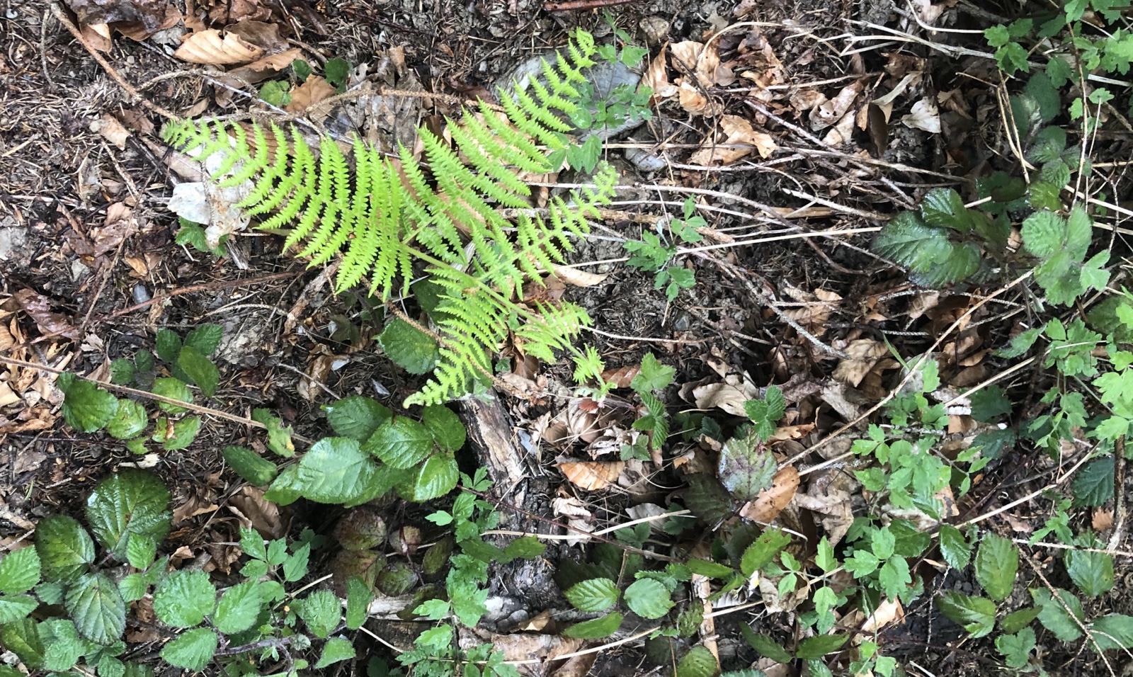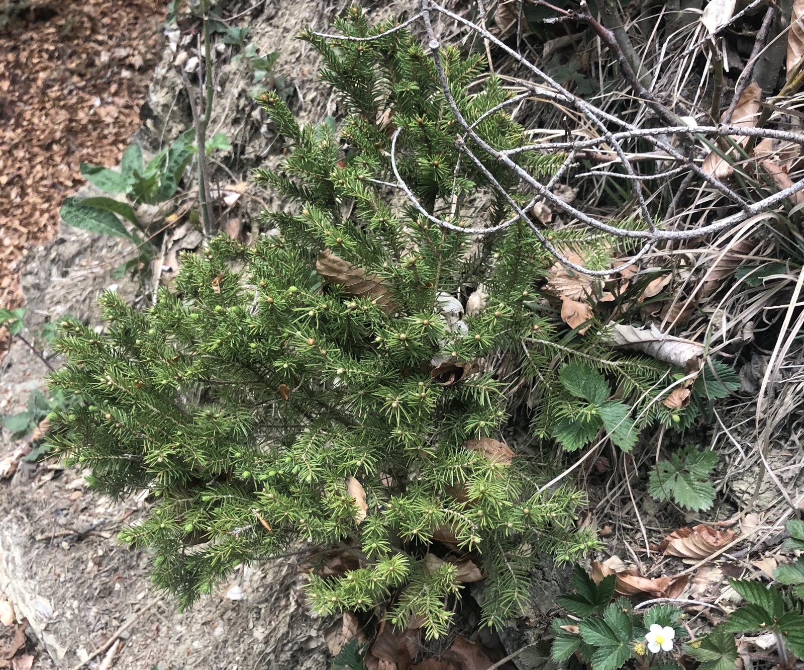 Dann aber muss ich unter einer grossen Tanne dennoch anhalten. Rasch fällt nun die Temperatur, es wird kühler. Ich ziehe mein nasses T-Shirt aus, trockne mich mit dessen trockenem Rückenteil und ziehe eein in der Radtasche mitgeführtes trockenes Ersatzshirt an. Sofort habe ich wieder warm genug und kann mich nun den Pflanzen unter der Tanne widmen.