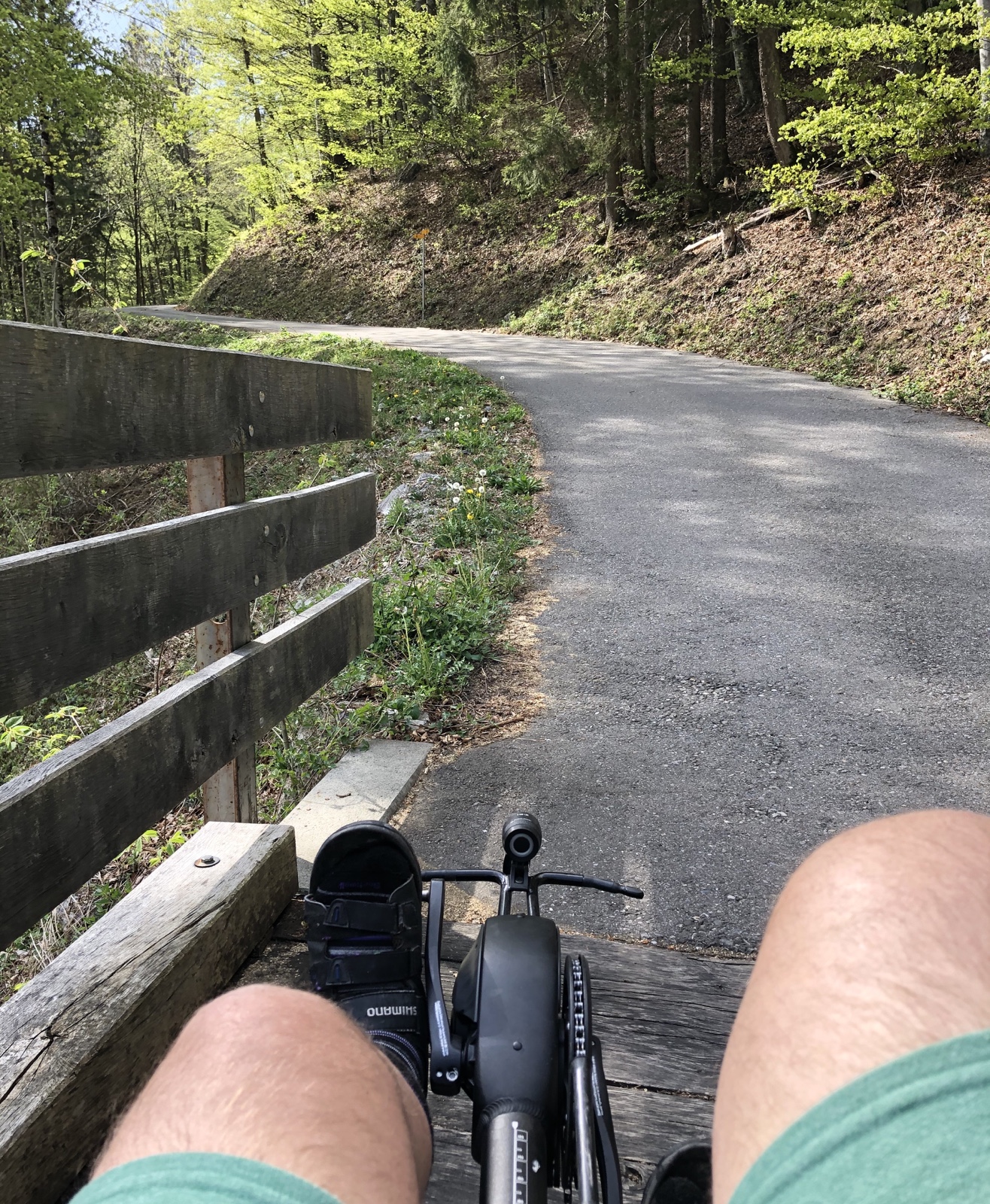Der kleine Bach auf der Strasse fliesst munter weiter. Ich lasse mein Trike dennoch wieder weiter rollen.