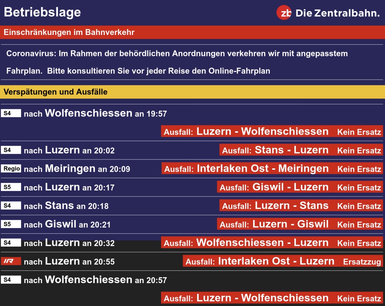 Neuerdings würden auf den Infomonitoren in Zügen und Bahnhöfen der zb (Zentralbahn) nur noch die ausfallenden Züge plakatiert und angezeigt. Dies sei entgegen allen Vorschriften der zb und SBB!