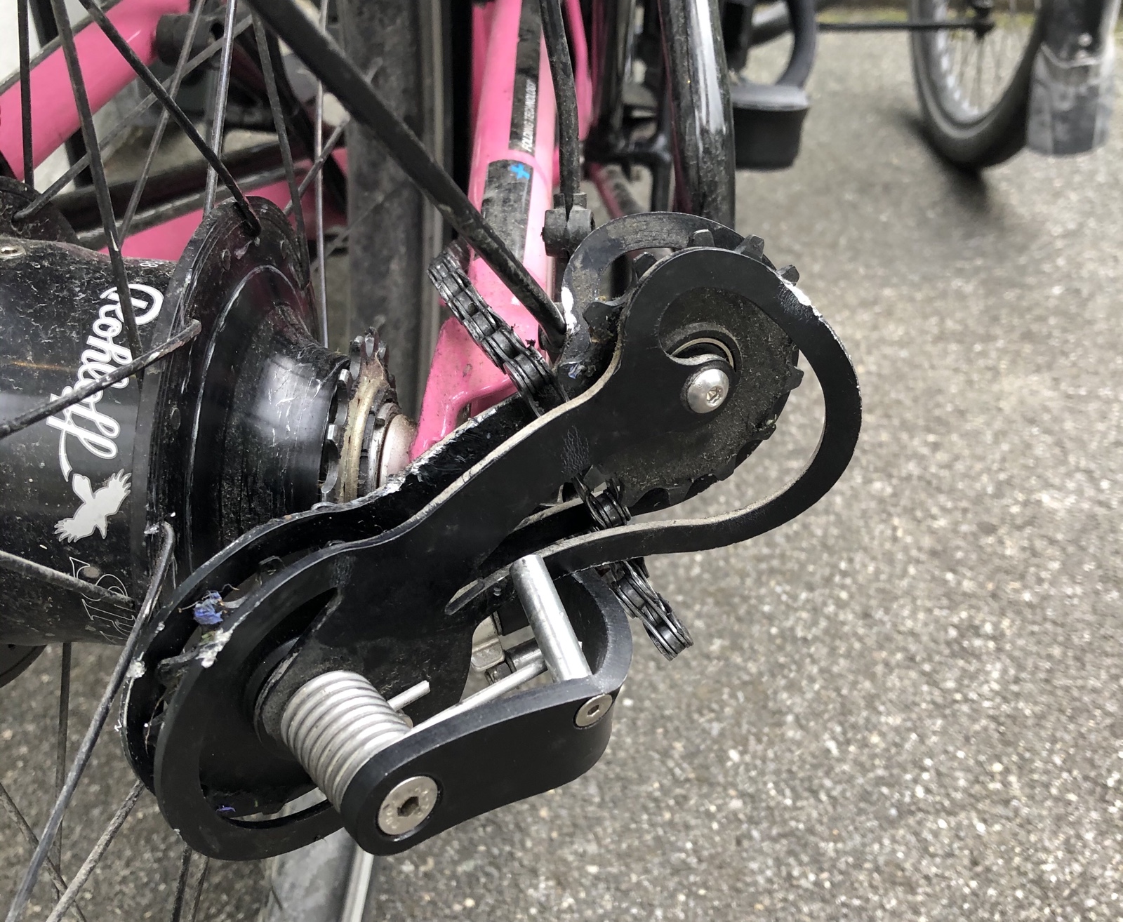 Dann hole ich mein Trike beim Velohändler. Er kann den verbogenen Kettenspanner nicht reparieren.