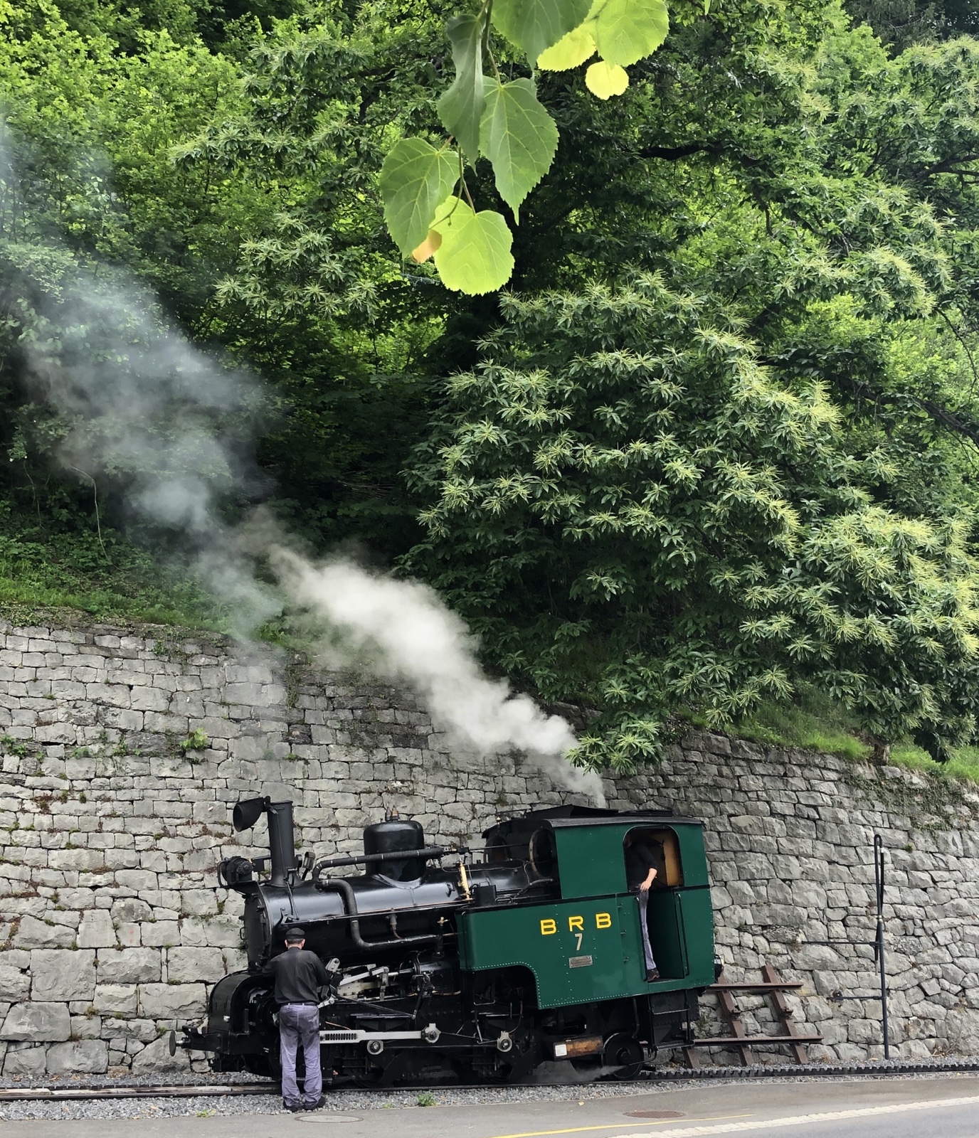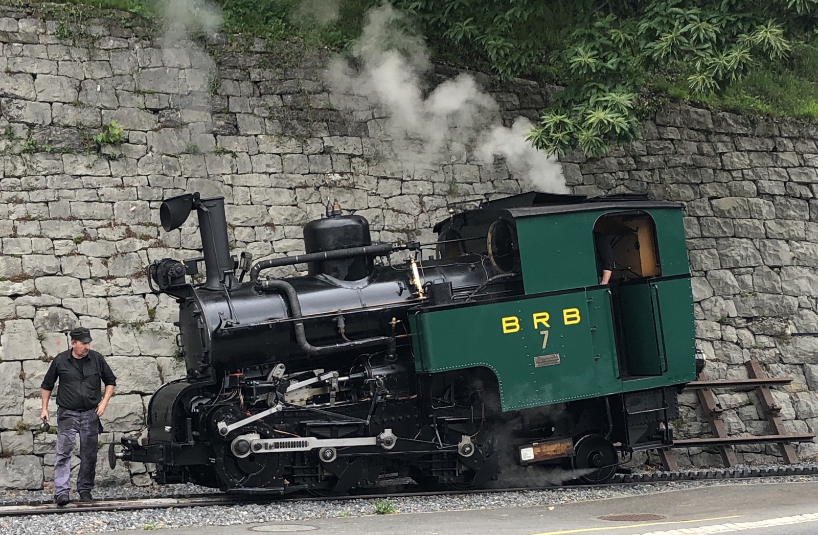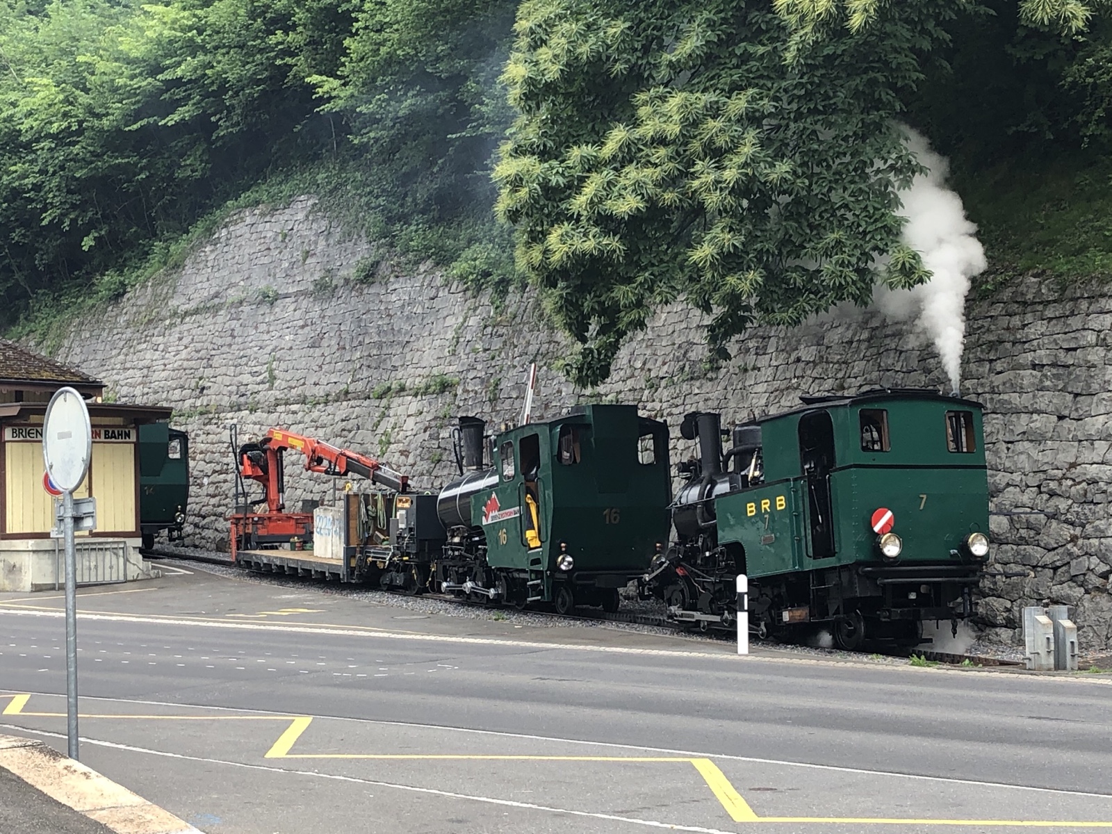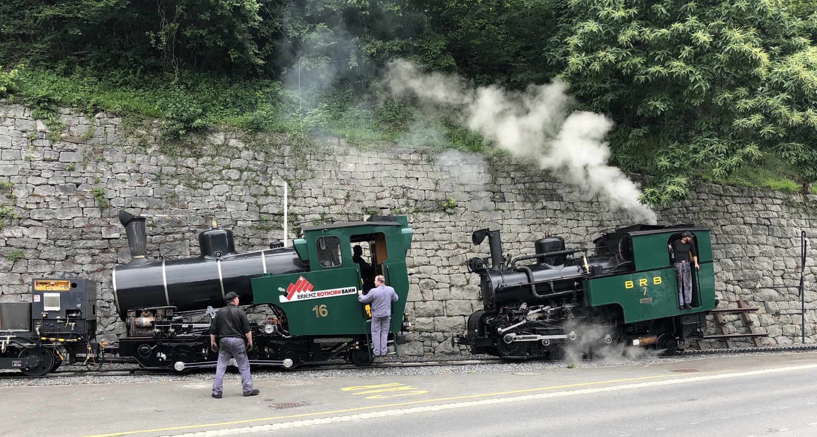 Aha, die Brienz Rothorn Bahn bereitet sich mit Samstagsarbeit auf die kommende, am 11.06.2020 beginnende Fahrsaison vor. Zuerst erscheint die Nummer 7 eine mit Kohle gefeuerte Dampflok von 1936 am unteren Gleisende gegenüber vom Bahnhof Brienz.