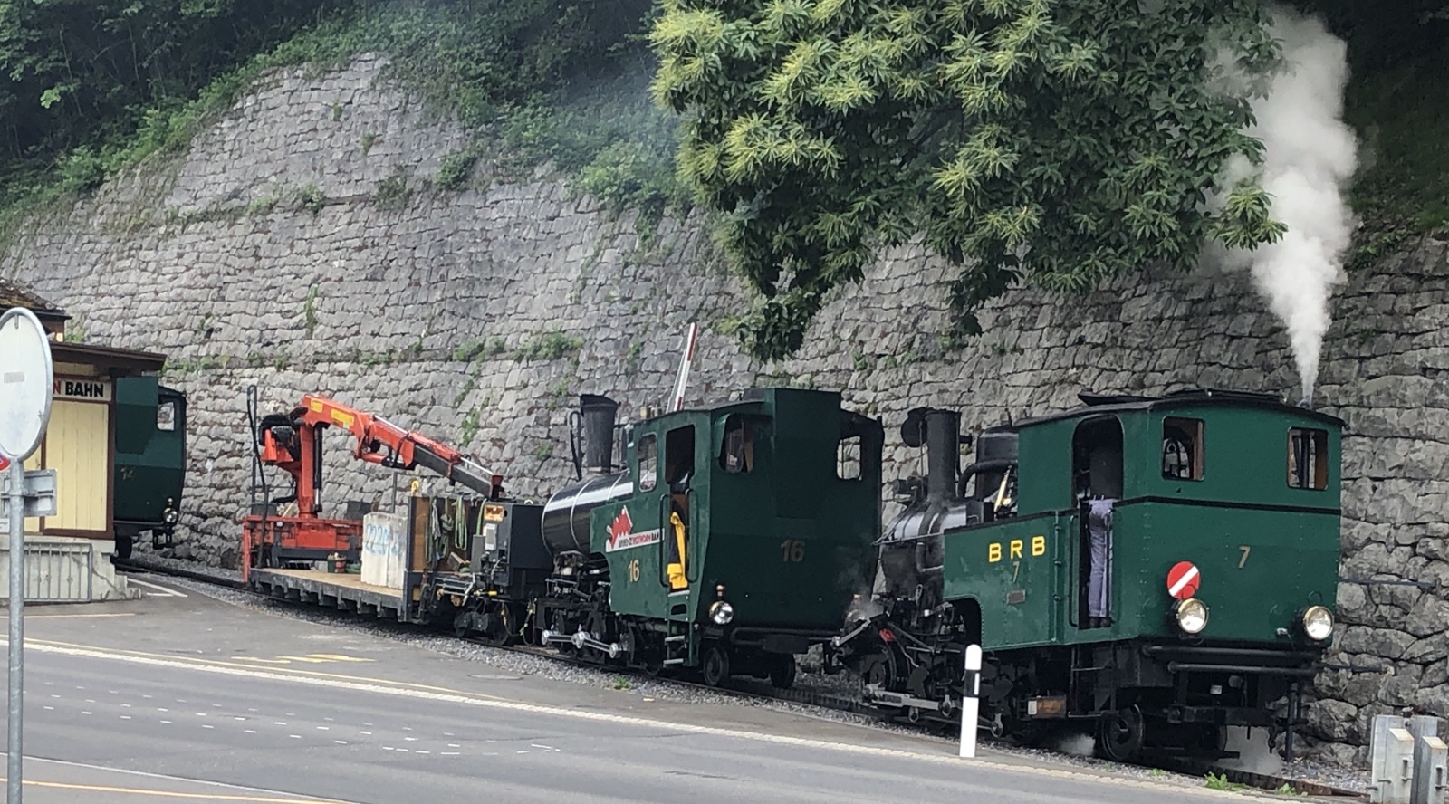 Ich habe richtig gerochen. Denn nun kommt nämlich eine dieser neueren Diesel-Dampflokomotiven. Nummer 16 wurde 1992 erbaut, war bis 2004 bei der Bahn zum Rochers-de-Naye. Ihr vorangestellt ist ein Güter- bzw Dienstwagen mit Kran. Als Dritte folgt die Nummer 14 von 1996.