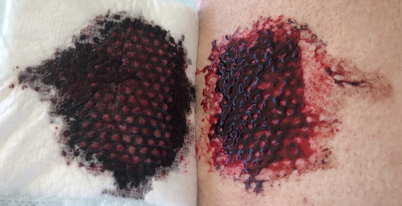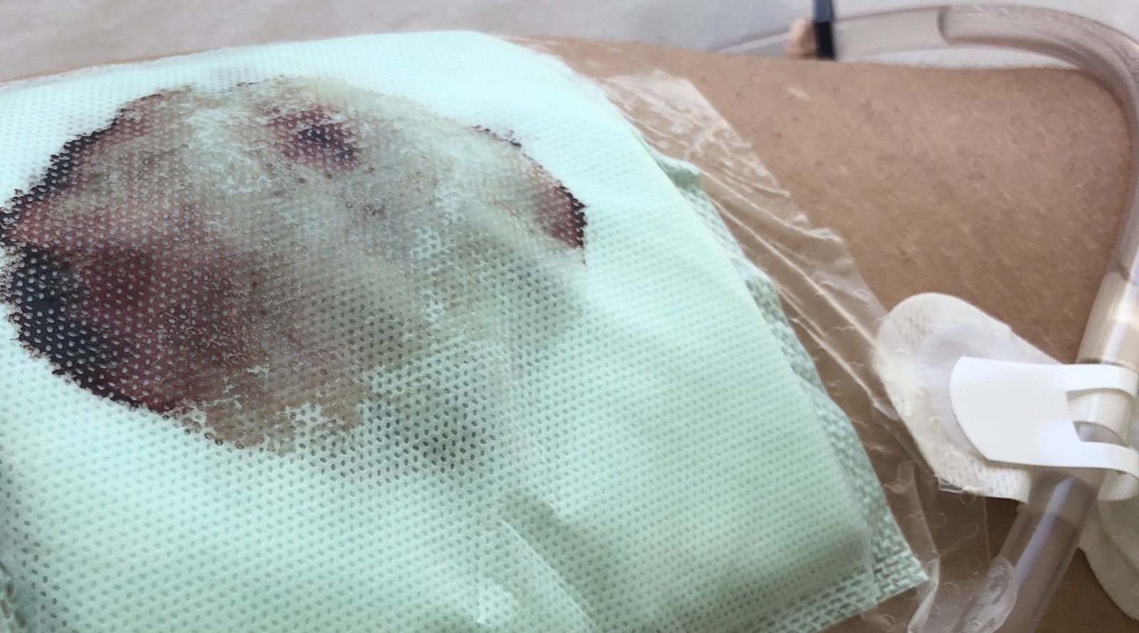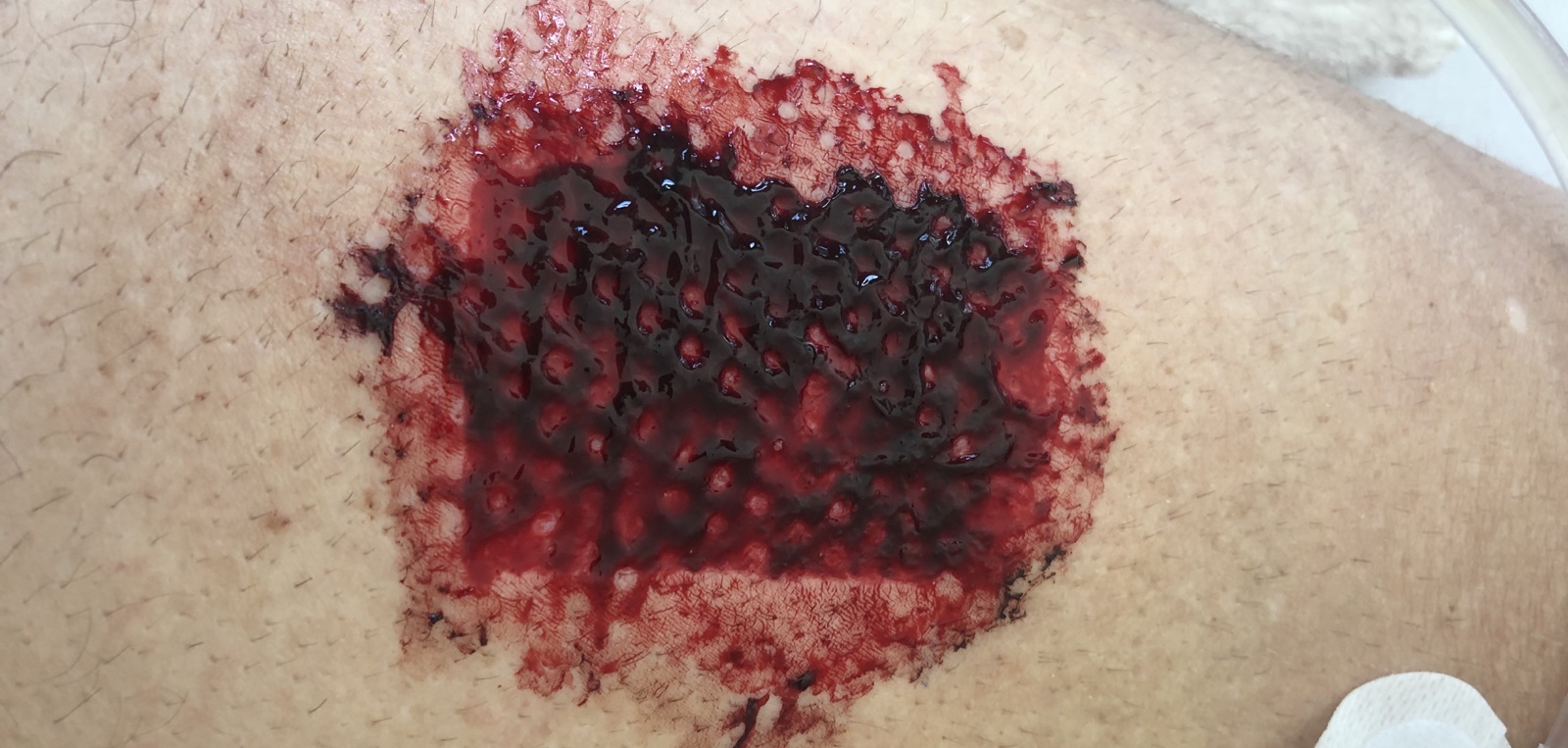 Am Freitag morgen wird der erste Verband gewechselt. Die Wunde, da wo die Haut (geschätzt 2 Mal 4 Fingerbreiten lang und 1,5 Fingerbreiten breit) entnommen wurde, blutet noch immer.