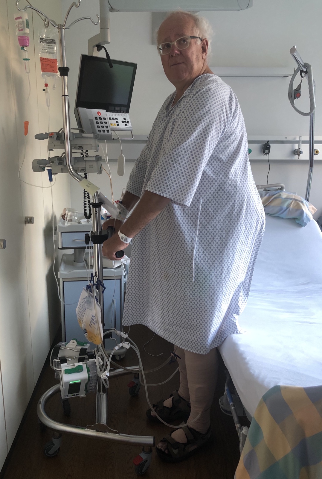 Wenn ich geweckt werde für die Pflege, das Essen oder aus weiss nicht was für Gründen, bin ich leider ein paar Mal missmutig und abgeschlagen. Die 3 Schläuche für Wundflüssigkeiten und Urin die von meinem Körper wegführen und die zwei Transportleitungen die zu meinem Handgelenk und zum Rücken führen, sind mir einfach zu viel. Ich kann mich kaum bewegen, fühle mich blockiert, habe hin und wieder Schweissausbrüche, friere hin und wieder. Die Pflegefachfrauen HF, ein Pflegefachmann HF und die Fachfrauen Gesundheit EFZ sind vom frühen Morgen bis spätabends fröhlich und freundlich.