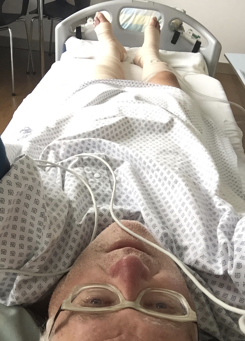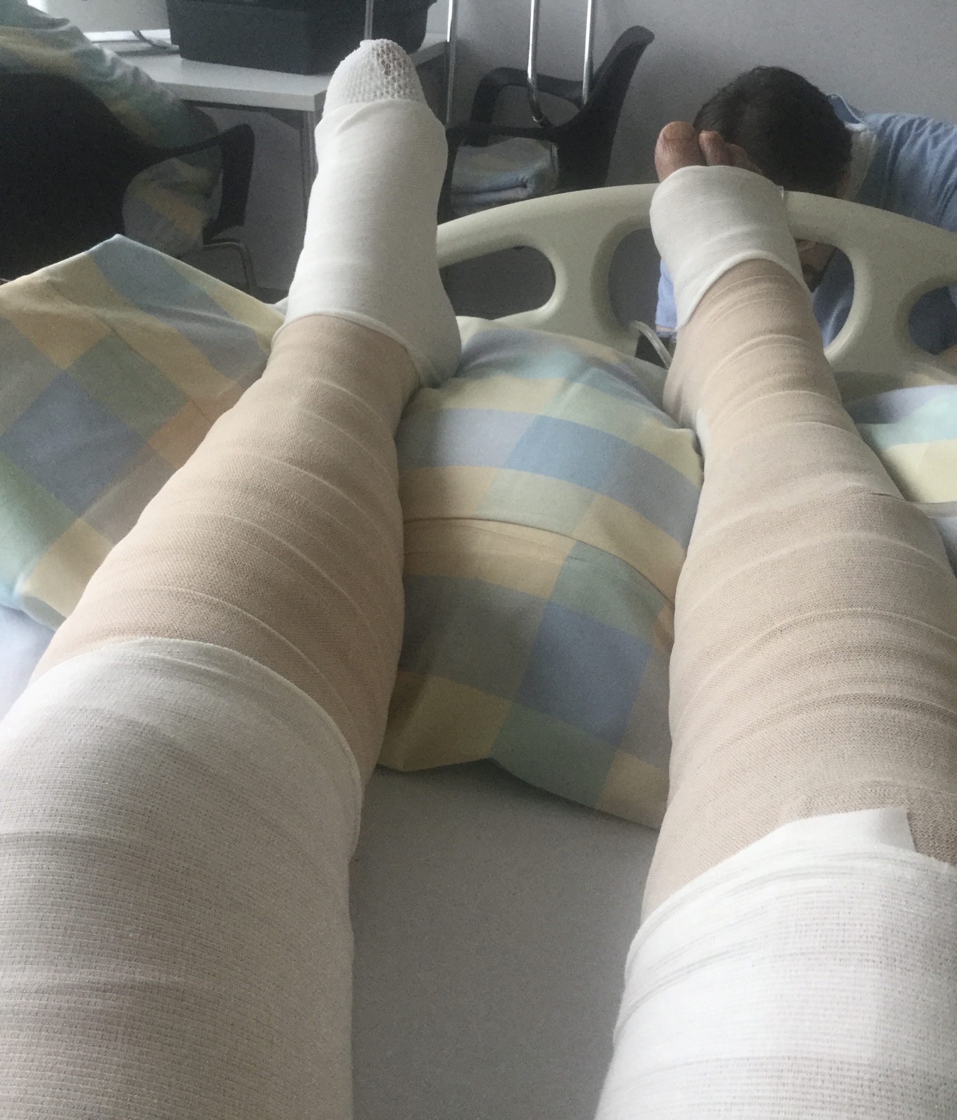 Schon nach 3 Tagen im Spital setzt eben diese sogenannte Gesundheitsfachfrau gegen meinen Willen und der Erklärung, dass andauerndes Verbinden meiner Haut mehr schaden denn nützen würde, mit Hilfe von Ärzten durch, dass ich beide Beine von den Zehen bis zu den Oberschenkeln unter einem Wollstrumpf und elastischen Binden verstecken muss.