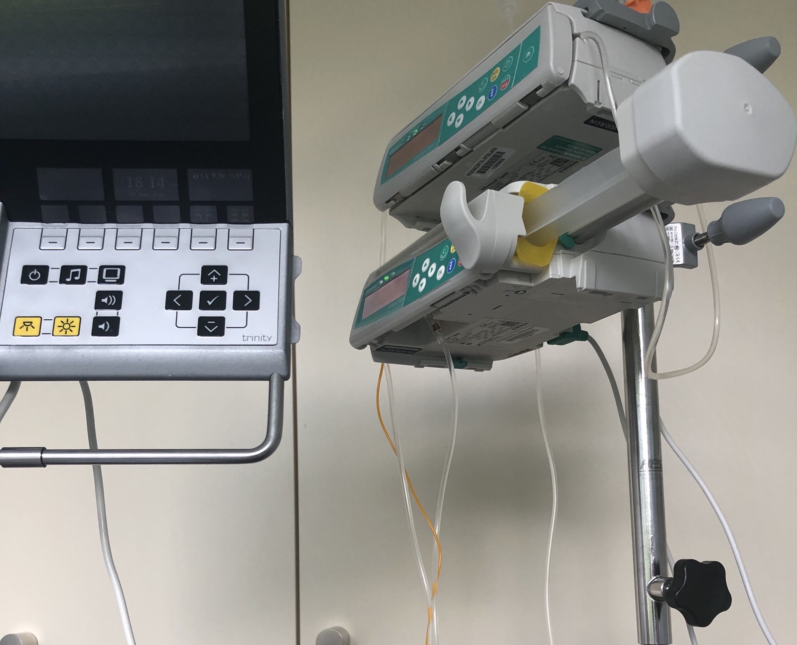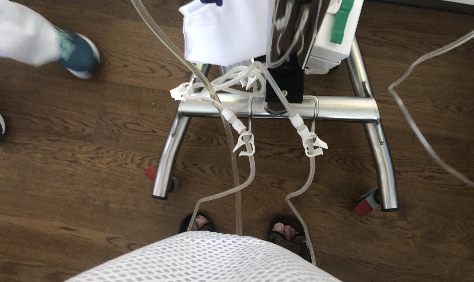 Die Einstellung der Menge des Anästetikums mit dem ich versorgt werde, macht mir am Abend grosse Sorge. Neben der Gefühlslosigkeit von den Hüften an abwärts, spüre ich plötzlich auch, wie sich der Brustkorb langsam schlafen legt, dann schläft die Brust ein und der Hals wird langsam eng.