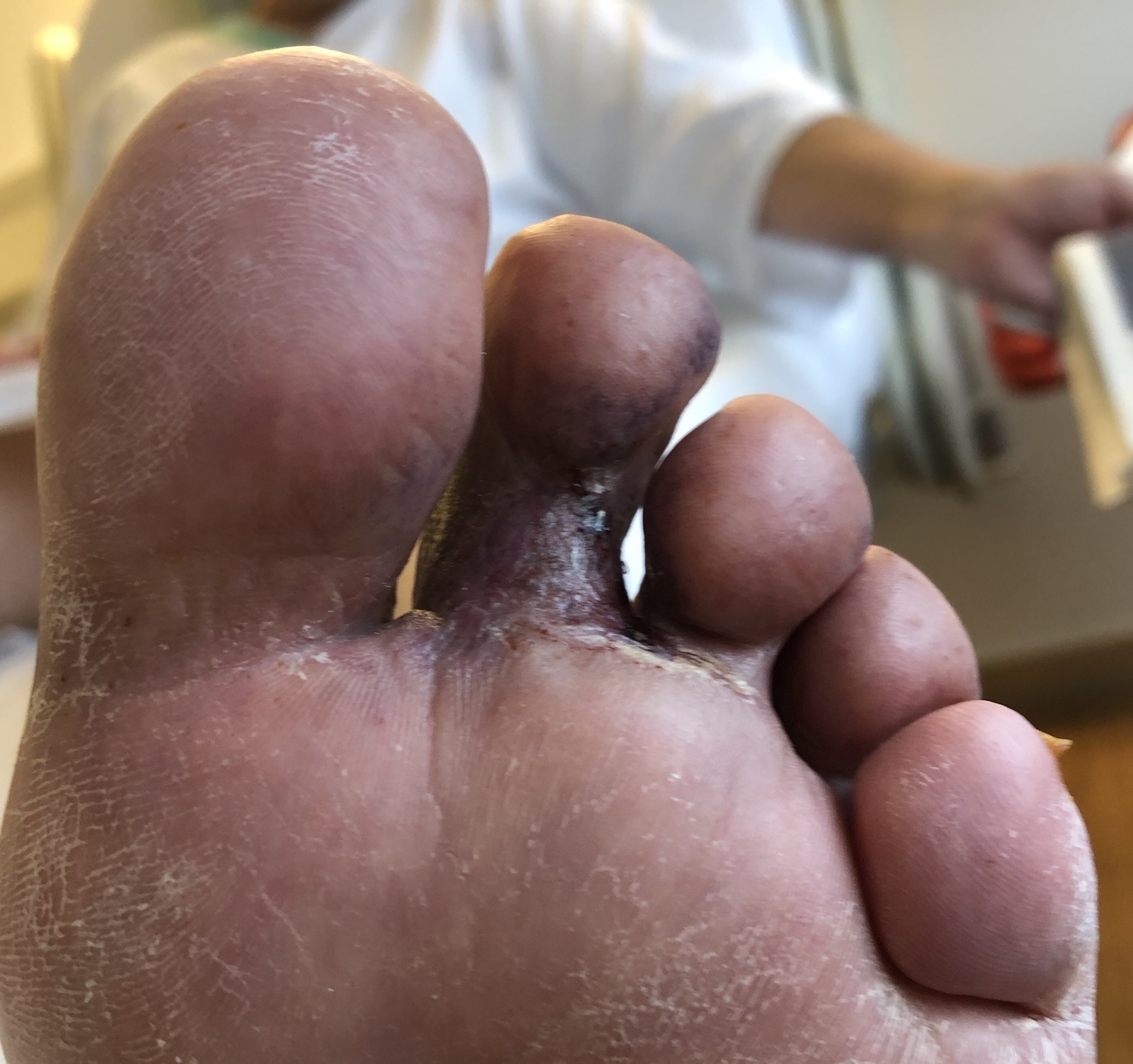 Seither geht es rapide bergab mit der Gesundung meiner Haut. Nach wenigen Tagen kommt zudem eine durch was auch immer verursachte Wunde an den Zehen des linken Fusses hinzu.