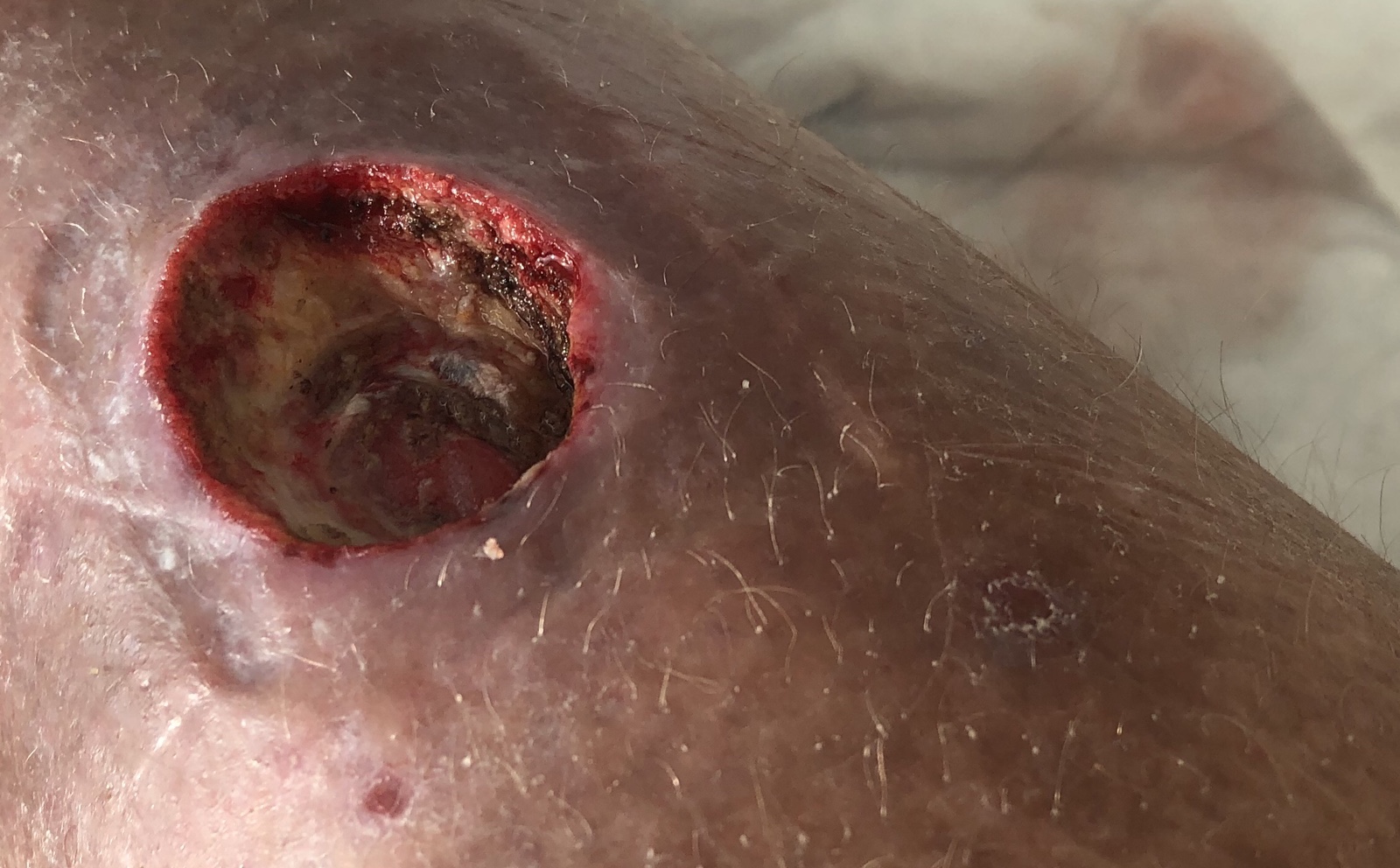 Als ich die Wunden nach der Operation das erste Mal sehe, wird es mir schlecht. Die grösste der vorherigen Wunden war jetzt ein kreisrundes Loch, 41 Milimeter im Durchmesser und bis auf die Knochen gehend.