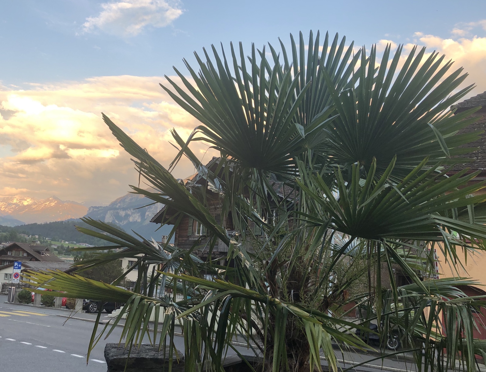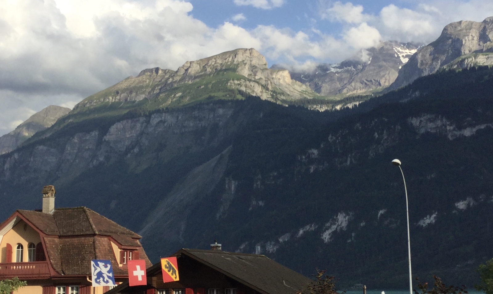 Ist das Morgenrot echt oder spiegelt sich die Beleuchtung im Zug in den Fenstern des Zugs?Welch ein Gegensatz: oben die beschützenden Berge und der beruhigende See, unten das grelle Grün Gemüsefelder und die Juraügel im Hintergrund