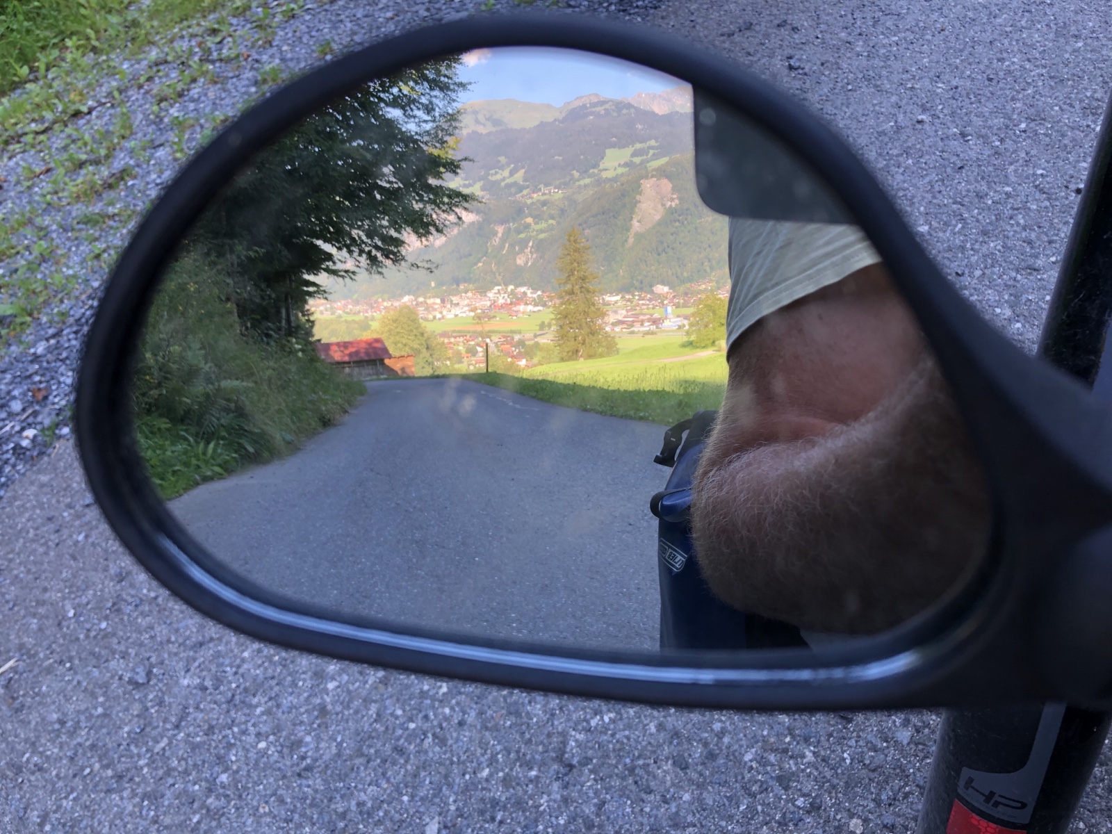 Erst als die Strasse nicht mehr ganz so stark ansteigt, mag ich anhalten und noch einen richtigen Blick zurück nach Meiringen tun.