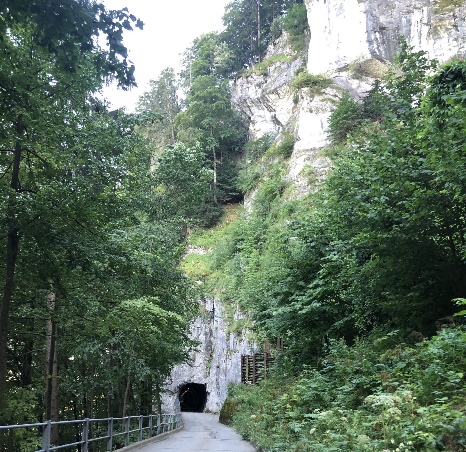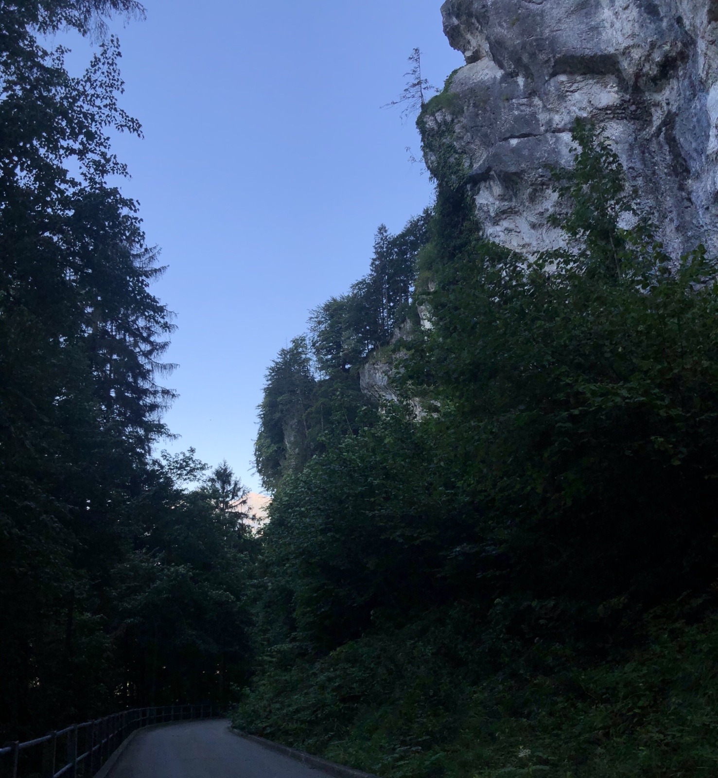 Im tiefen Wald unter den steilen Felswänden ist es, trotzdem dass es erst 18:35 Uhr ist, schon recht dunkel (und gfürchig).