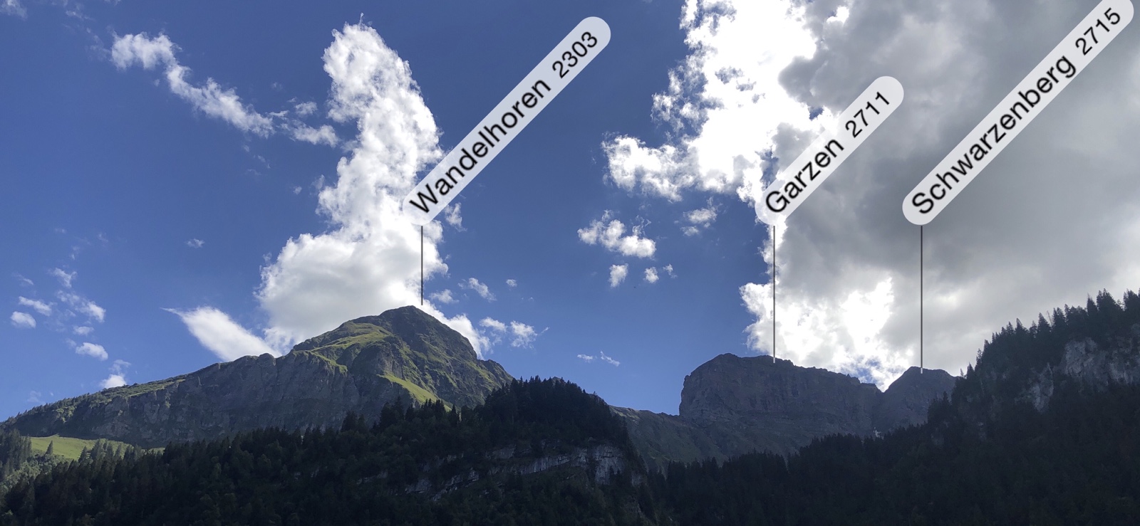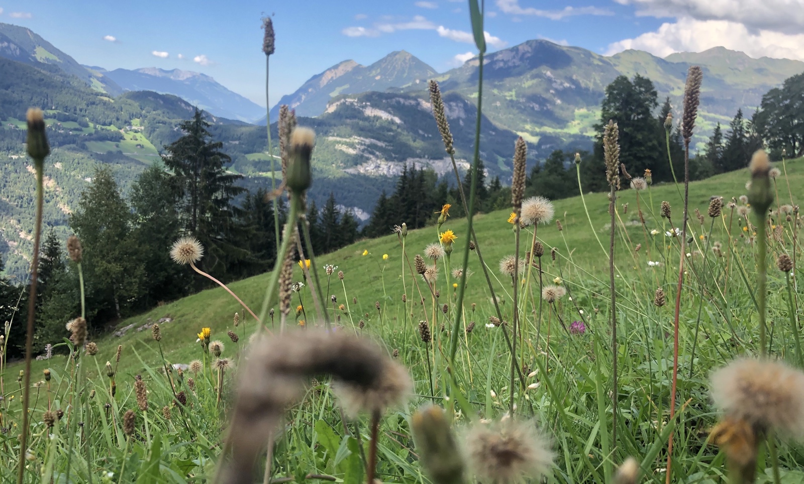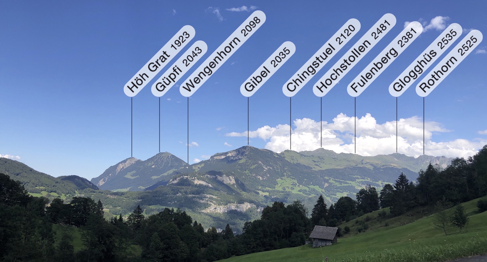Hier beende ich meine heutige Bergfahrt. Lange geniesse ich die tolle Aussicht auf die Berge rundherum und ins Tal.