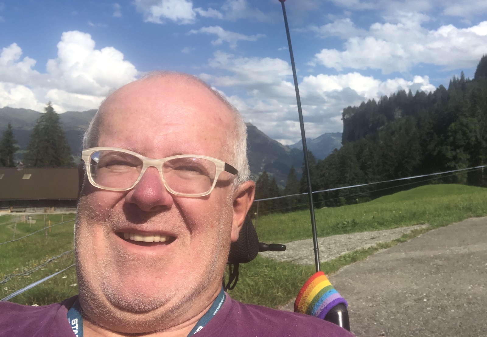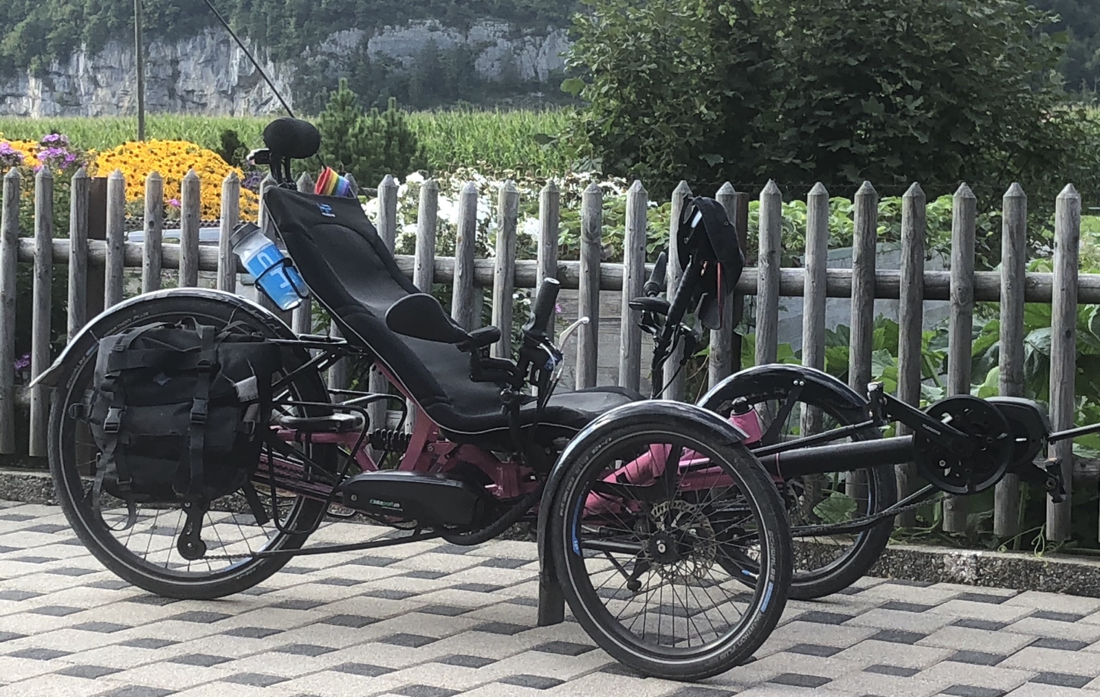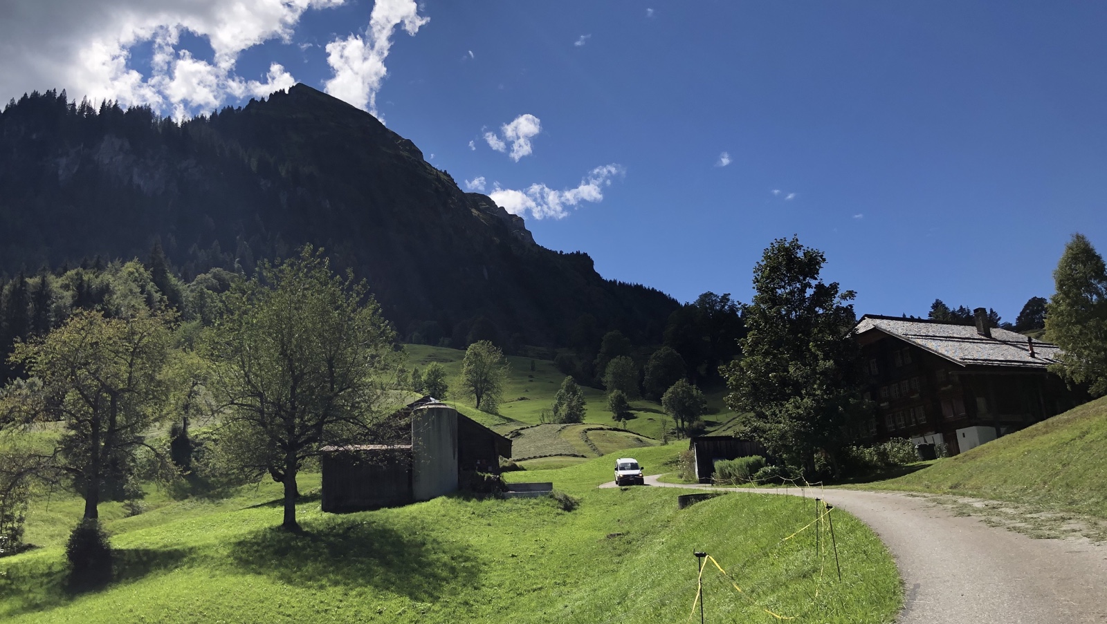 Oberhalb der “Flüe“, ist die Strasse plötzlich nur noch geschottert, bzw Kies und Gras. Nun ist der grösste Nachteil des externen Antriebs des Dreirads, sofort spürbar: immer häufiger dreht das Hinterrad durch. Immerhin 500 Höhenmeter und 17 Kilometer Wegstrecke habe ich absolviert.