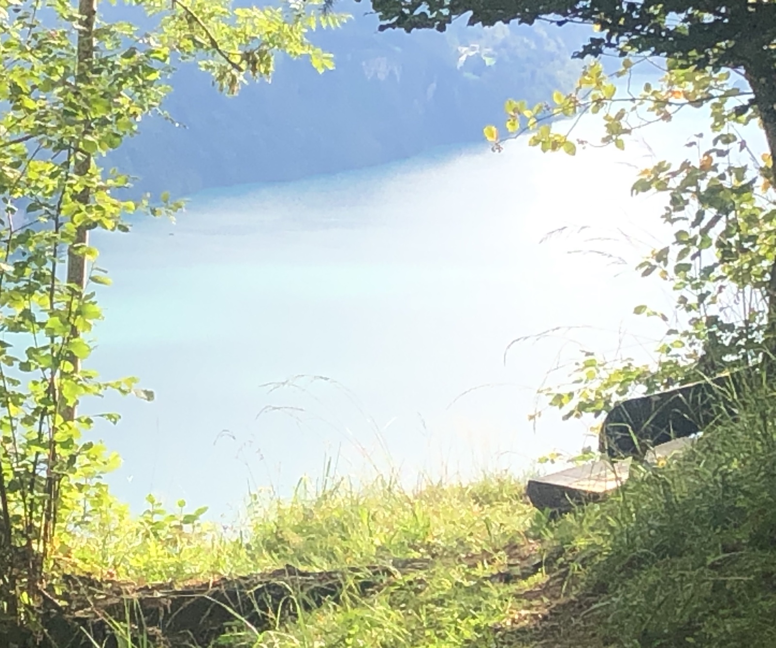 Ganz unten in der Schwanderfluh führt die Strasse mal bis an den senkrecht abfallenden Fluhberg heran. Ein findiger Mensch hat hier auf ziemlichgenau 1’000 Meter über Meer ein Bänklein aufgestellt, von dem aus sich ein einmalig schöner Ausblick auf den See und die Berge eröffnet.